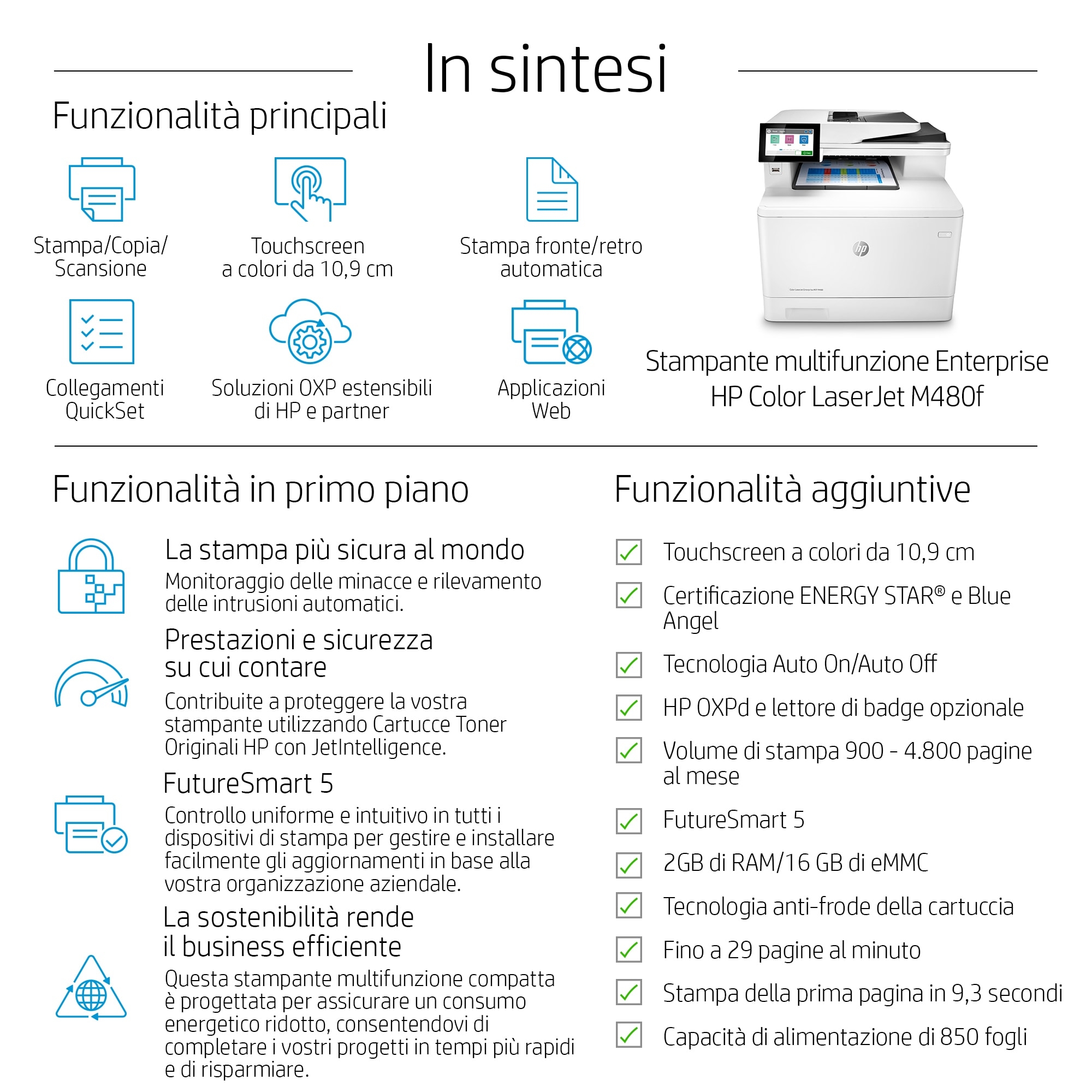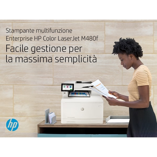 HP Color LaserJet Enterprise Stampante multifunzione Enterprise Color LaserJet M480f. Tecnologia di stampa: Laser, Stampa: Stampa a colori, Risoluzione massima: 600 x 600 DPI, Velocità di stampa (colore, qualità normale, A4/US Letter): 27 ppm. Copia: Copia a colori, Risoluzione di copia massima: 600 x 600 DPI. Scansione: Scansione a colori, Risoluzione di scansione ottica: 600 x 600 DPI. Fax: Fax a colori. Funzione duplex: Stampa, Copia. Massimo formato carta serie ISO A: A4. Wi-Fi. Stampa diretta. Colore del prodotto: Bianco, Nero