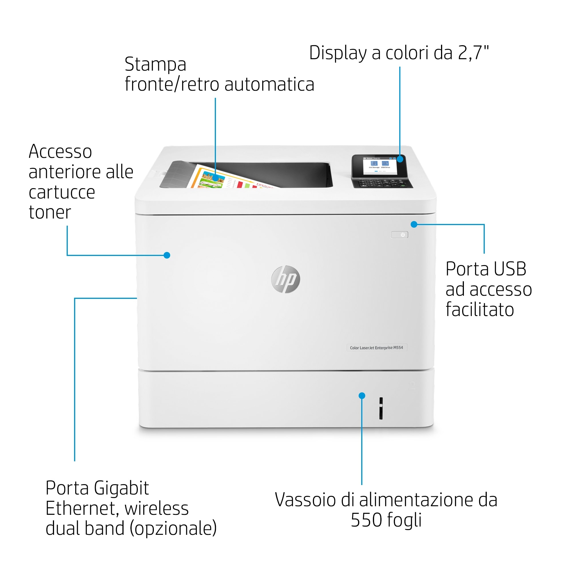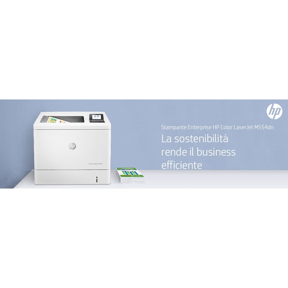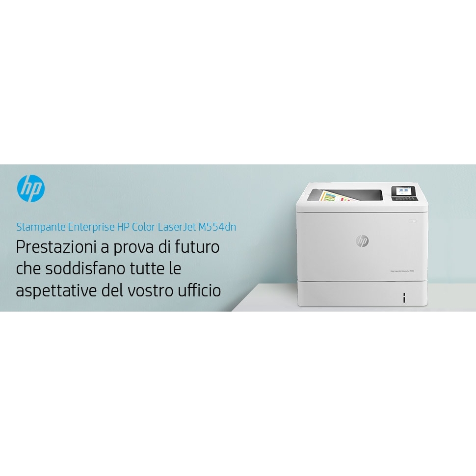 HP Color LaserJet Enterprise Stampante Enterprise Color LaserJet M554dn, Stampa, Porta USB frontale, Stampa fronte/retro. Tecnologia di stampa: Laser, A colori. Numero di cartucce di stampa: 4, Ciclo massimo di funzionamento: 80000 pagine per mese. Risoluzione massima: 1200 x 1200 DPI. Massimo formato carta serie ISO A: A4. Velocità di stampa (nero, qualità normale, A4/US Letter): 33 ppm, Stampa fronte/retro. Tipologia display: LCD. Rete pronta. Colore del prodotto: Bianco