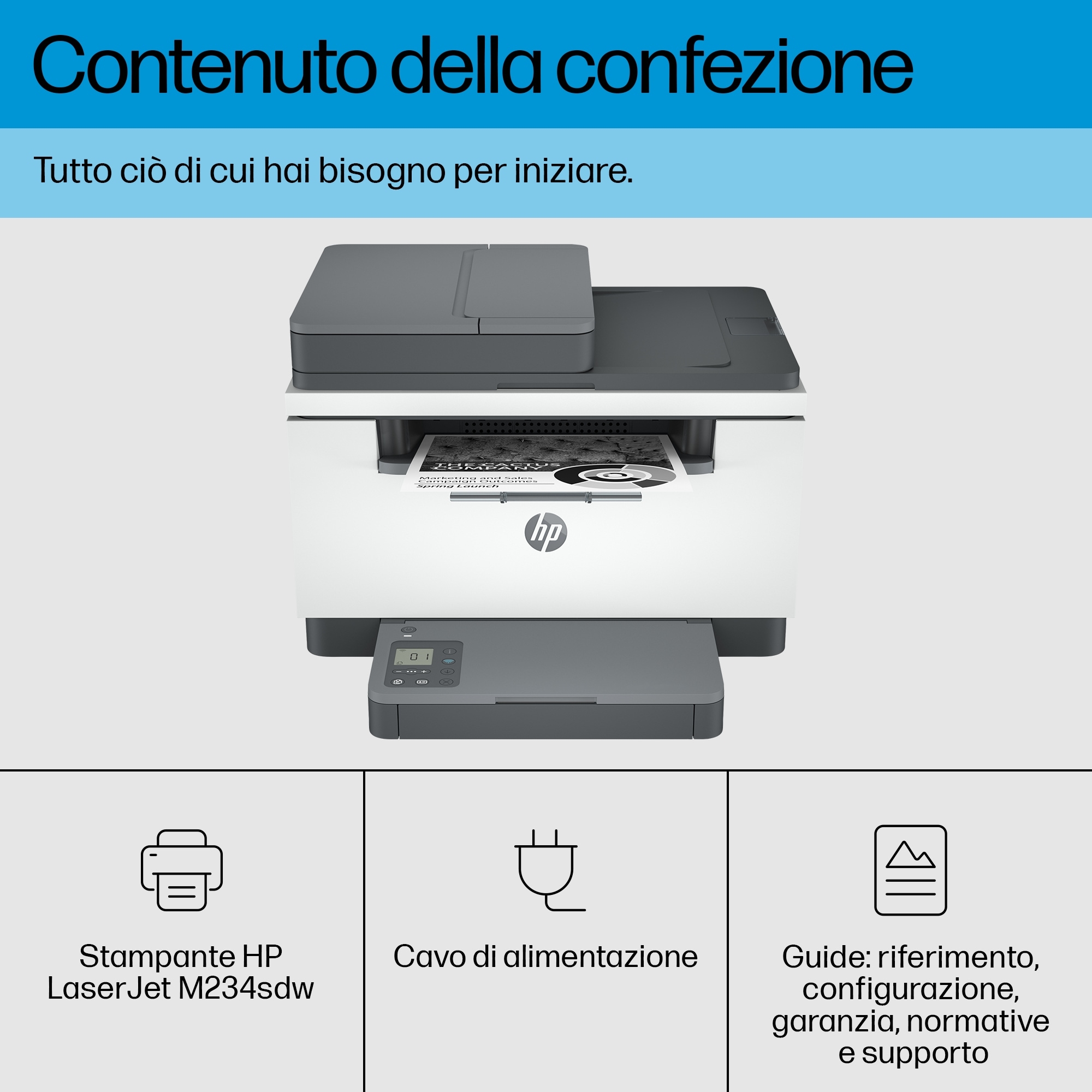 HP LaserJet Stampante multifunzione M234sdw. Tecnologia di stampa: Laser, Stampa: Mono stampa, Risoluzione massima: 600 x 600 DPI. Copia: Mono copia, Risoluzione di copia massima: 600 x 600 DPI. Scansione: Scansione a colori, Risoluzione di scansione ottica: 600 x 600 DPI. Funzione duplex: Stampa, Copia. Massimo formato carta serie ISO A: A4. Wi-Fi. Stampa diretta. Colore del prodotto: Grigio, Bianco