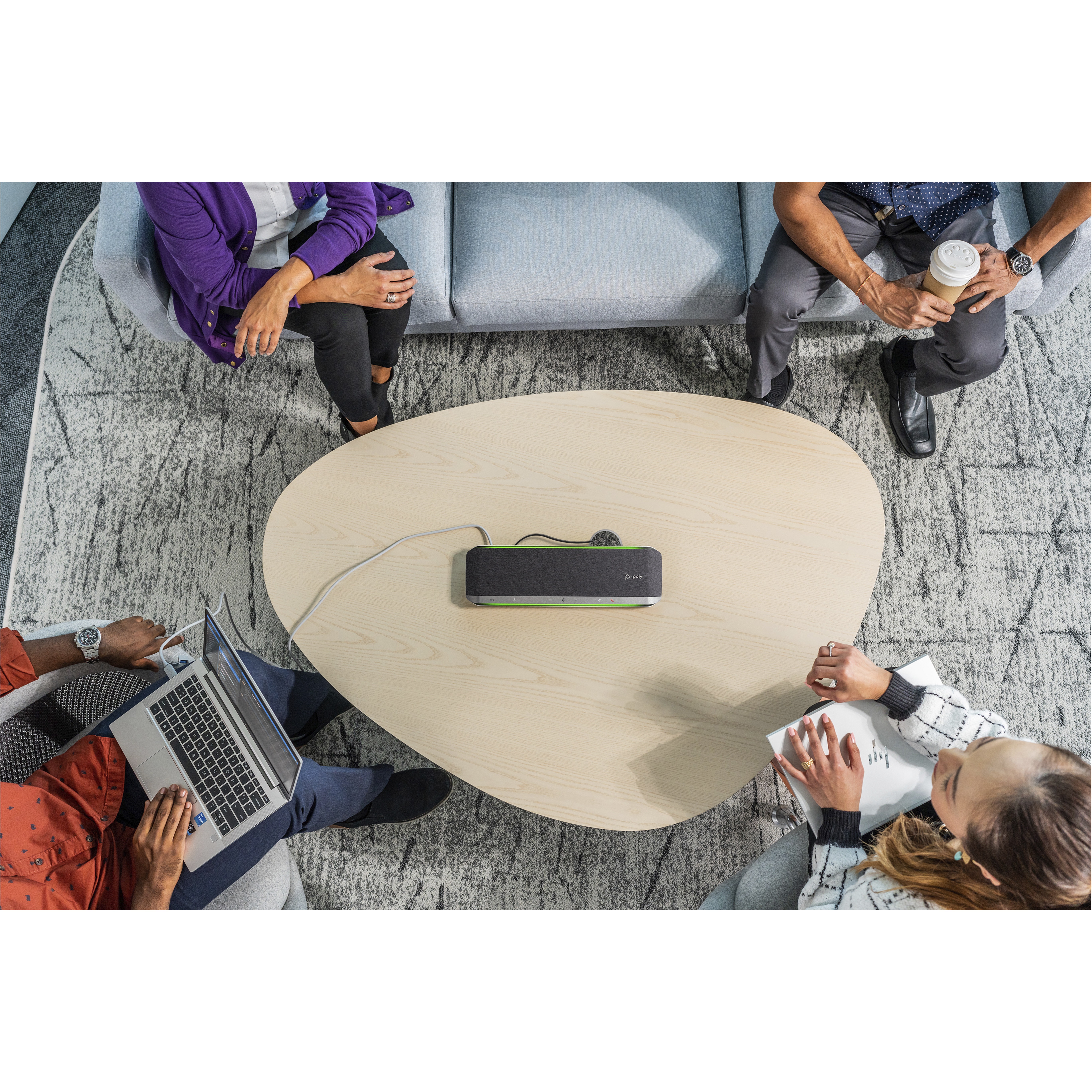 Massima qualità audio<br>Tutti hanno il diritto di sentire chiaramente tutto quello che viene detto durante la riunione. Dotato di una coppia di altoparlanti estremamente potenti, questo vivavoce intelligente diffonde laudio in modo chiaro e nitido in tutta la sala, mentre i sei microfoni catturano solamente la voce della persona che parla, escludendo i rumori.