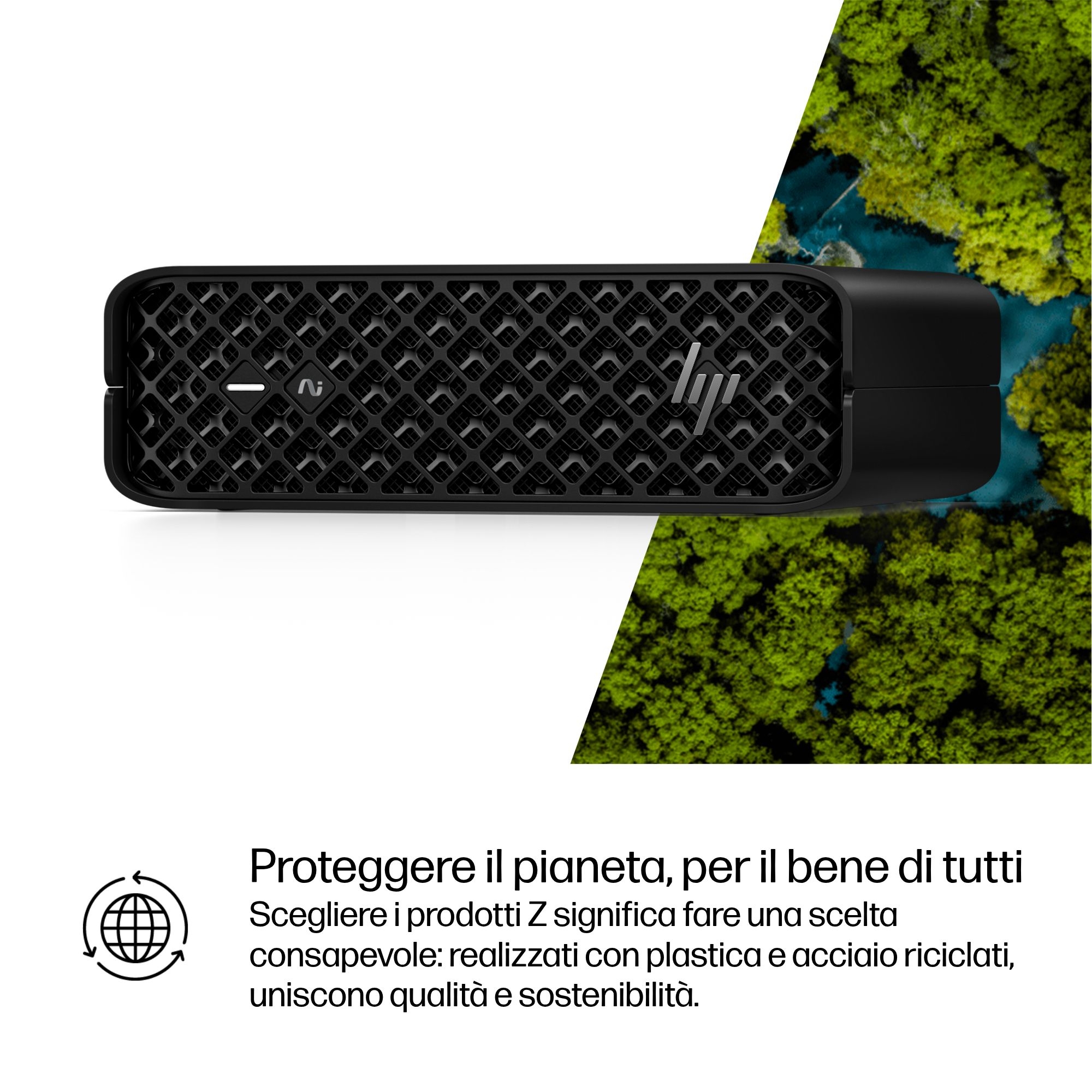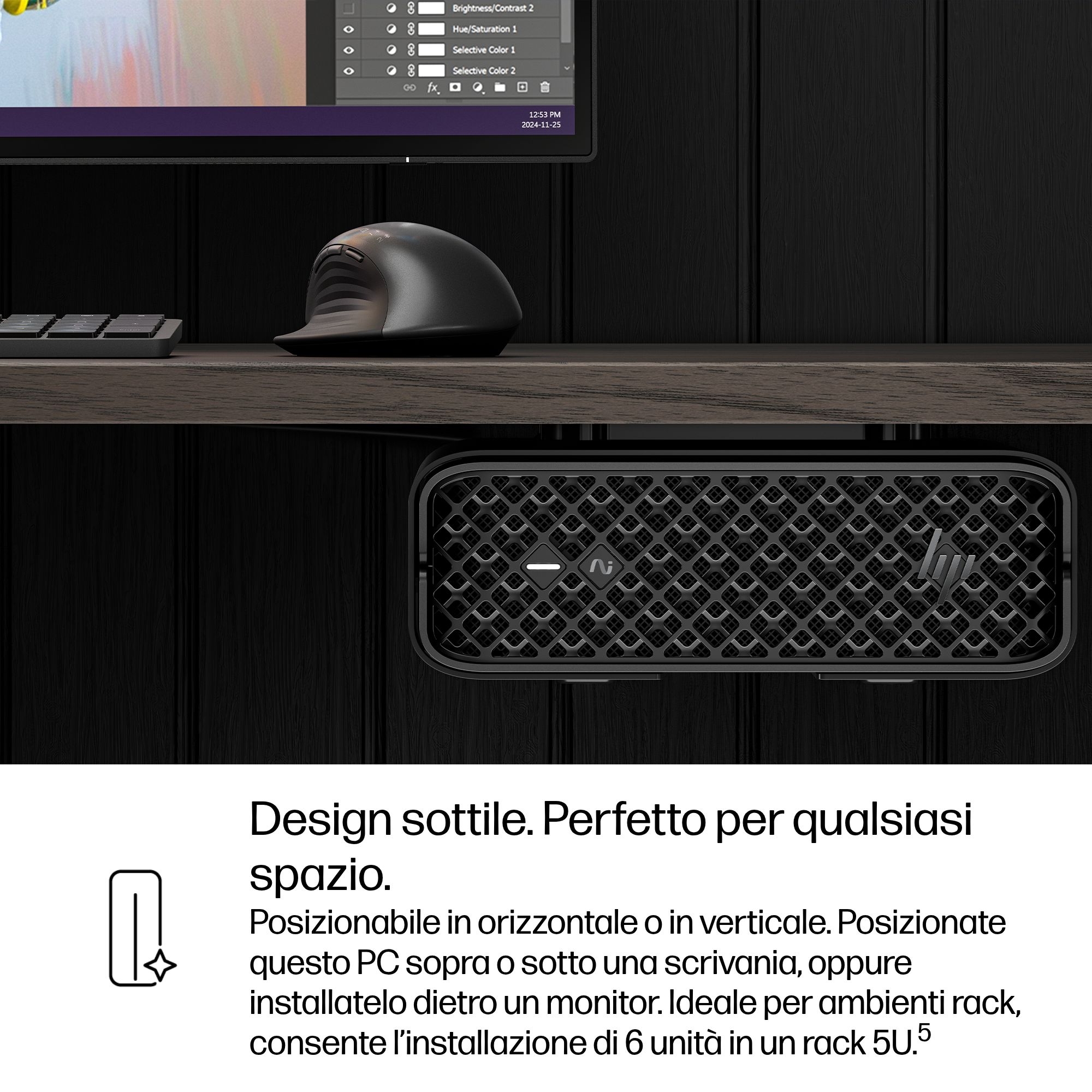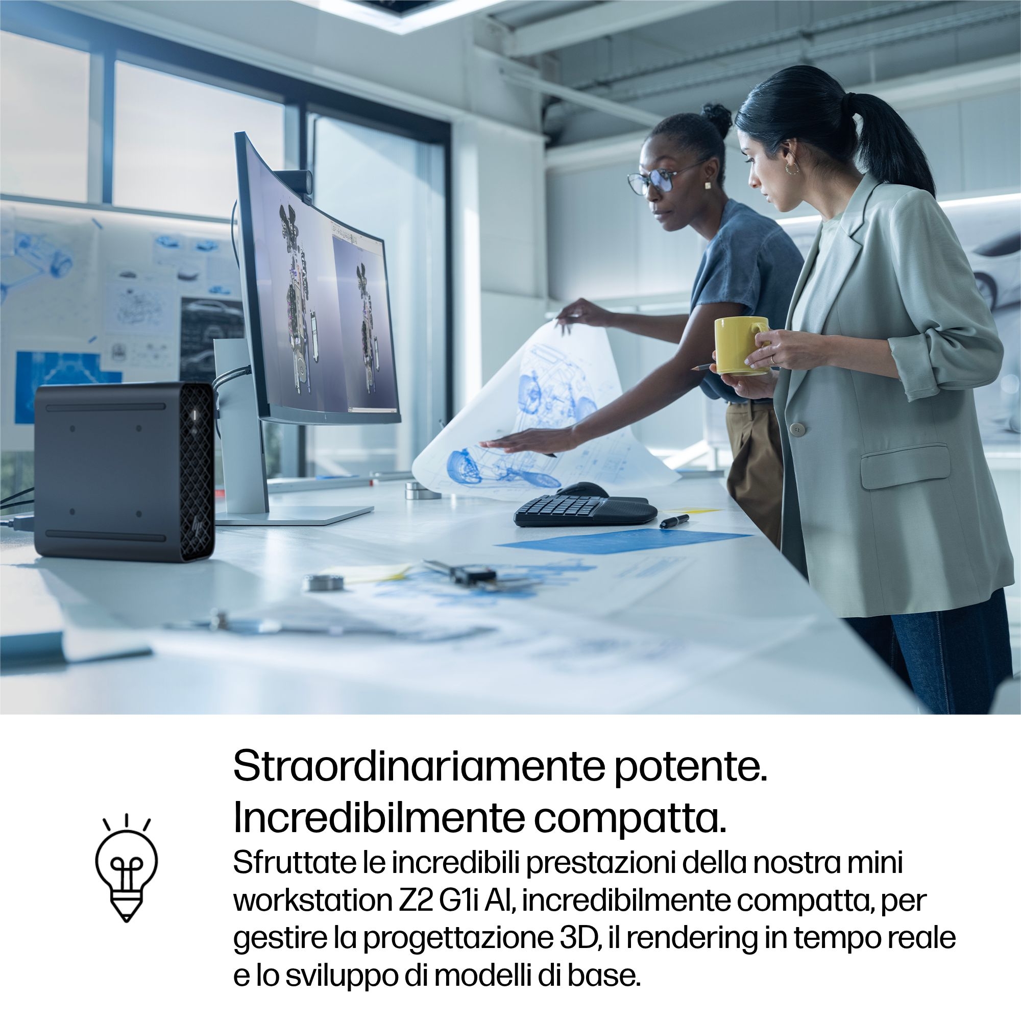 Tutta la potenza che serve per i flussi di lavoro più impegnativi, con un ingombro veramente minimo.<br>Sfruttate le incredibili prestazioni della nostra mini workstation Z2 G1i AI, incredibilmente compatta, per gestire la progettazione 3D, il rendering in tempo reale e lo sviluppo di modelli di base. Perfetta da posizionare sulla scrivania o dietro un monitor, per accedere comodamente alle sue porte. Se le vostre esigenze dovessero mutare nel tempo, potrete contare su un design incredibilmente versatile ed espandibile.