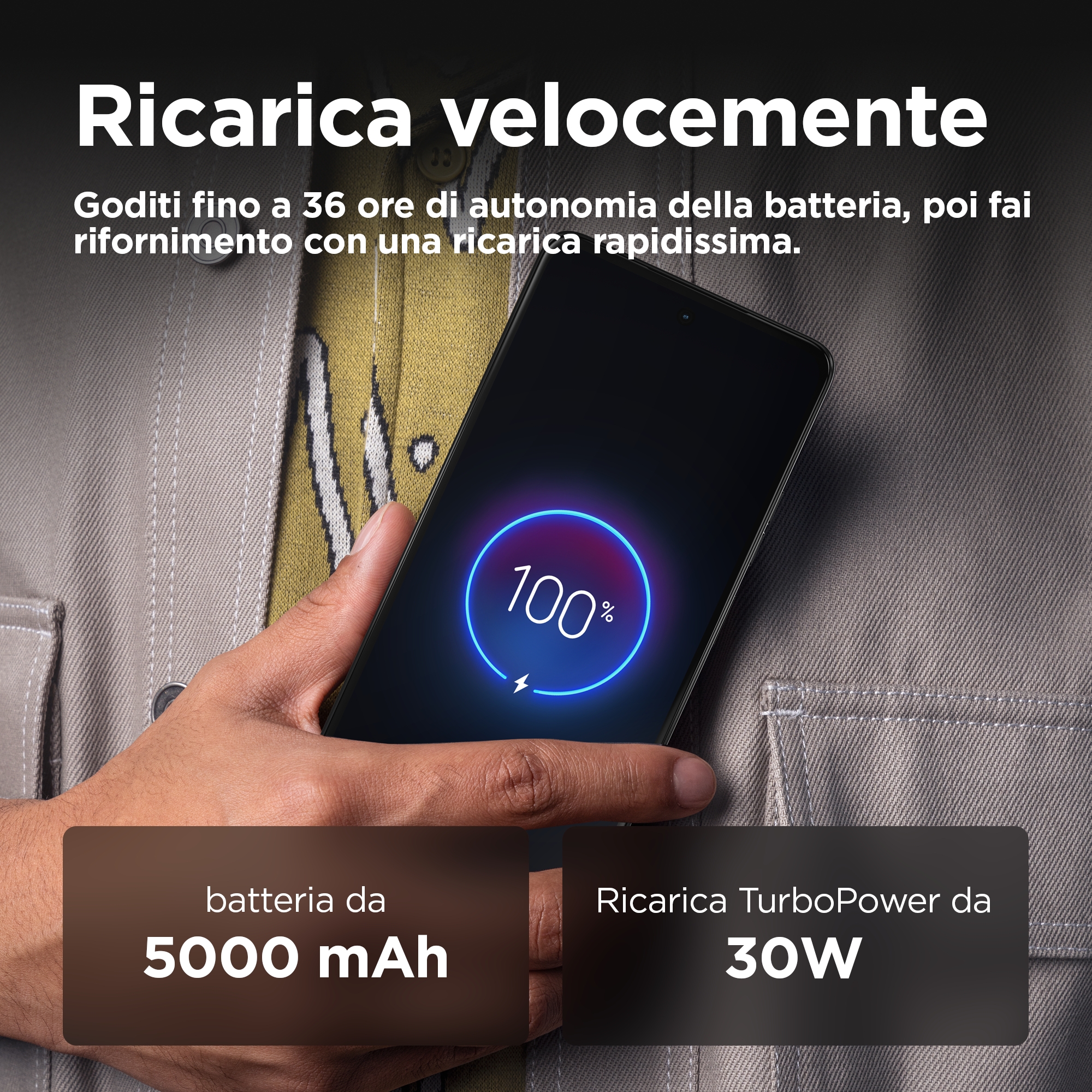 Progettato per stupire, realizzato per durare<br>Perché rinunciare allo stile per la resistenza, quando puoi avere entrambi? Ti presentiamo Moto g75 5G. Realizzato con materiali di prima qualità, resistenza conforme agli standard militari,(10) protezione IP68 per limmersione in acqua(2) e Corning® Gorilla® Glass 5, è pronto per le sfide di ogni giorno. Scatta foto nitide e bellissime e registra video perfettamente a fuoco con la fotocamera Sony - LYTIA™ 600 con stabilizzazione ottica dellimmagine. Vivi unesperienza di intrattenimento senza limiti sul luminosissimo schermo Full HD da 6,78" con audio Dolby Atmos®. Scegli di essere tra i primi a provare lefficienza intelligente del nuovissimo processore Qualcomm® Snapdragon® ed Estensione RAM. (3) Continua a esplorare contenuti senza interruzioni grazie alla batteria da 5000 mAh, alla ricarica TurboPower™ da 30 W(6) e alla ricarica wireless da 15 W opzionale(7). Il tutto con memoria interna fino a 256 GB(8,9) per salvare foto, musica, film e altro ancora. La vita è unavventura. Affrontala con stile con il nuovo Moto g75 5G.