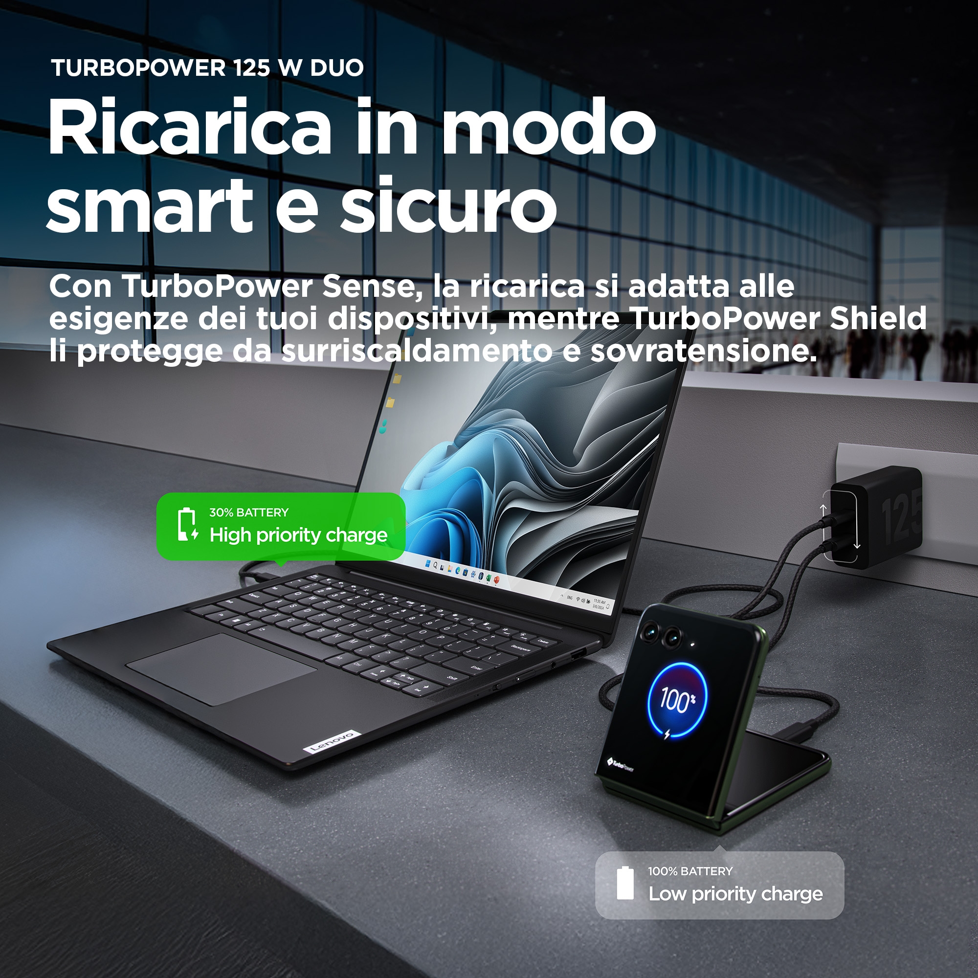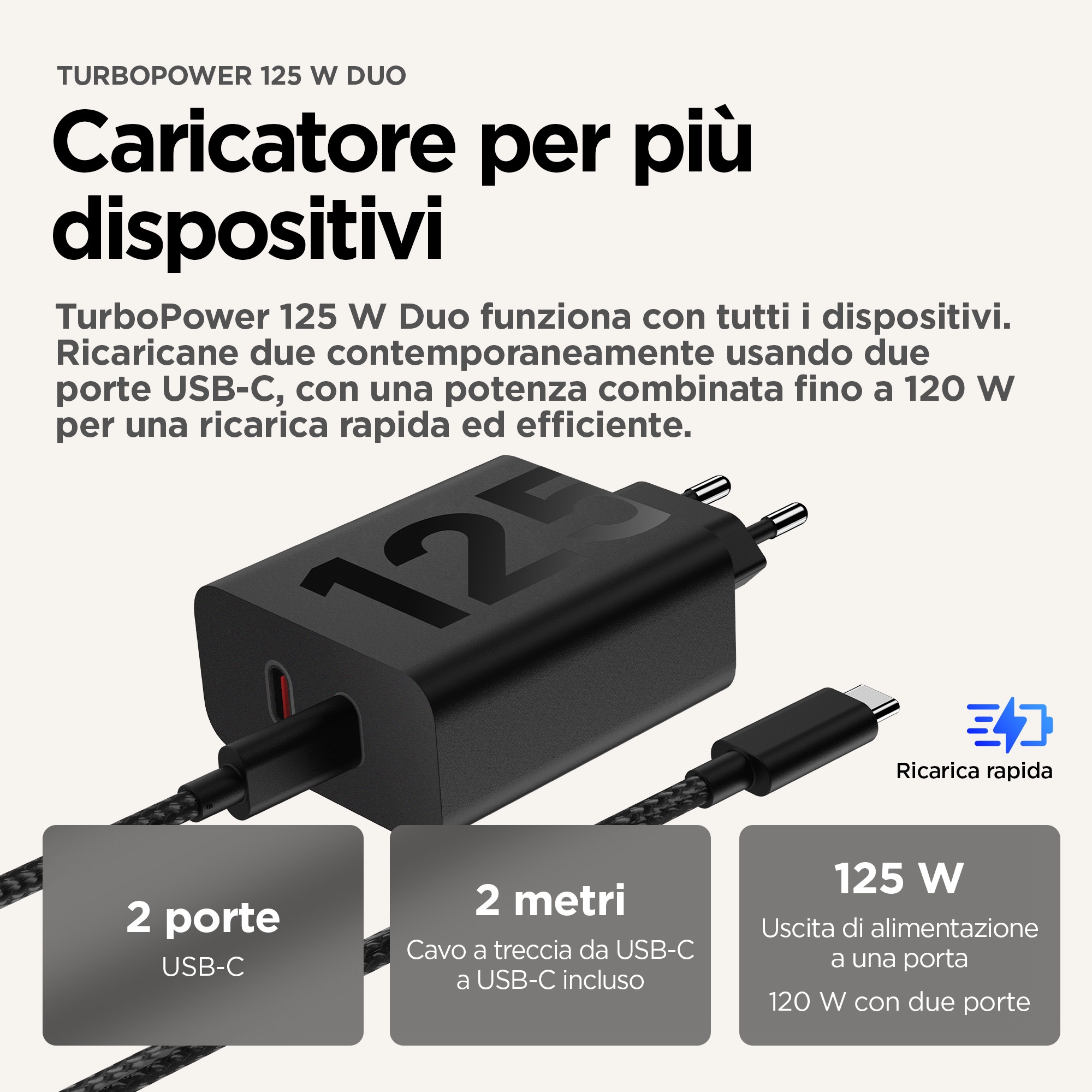 Caricatore universale per più dispositivi.(1)<br>Il nuovo caricatore TurboPower™ 125W Duo è compatibile con tutti i tuoi dispositivi(1), quindi è lunico di cui hai bisogno. Può anche caricare due dispositivi contemporaneamente. Con due porte USB-C®, non dovrai più scegliere quale caricare per primo. TurboPower™ Sense gestisce le priorità, regolando dinamicamente la velocità in base alle esigenze dei tuoi dispositivi in tempo reale.(2) Ricarica lo smartphone, il tablet, il laptop, lo smartwatch o gli auricolari, il tutto in pochi minuti. (3) Universalmente compatibile con un gran numero di dispositivi in tutto il mondo, il caricabatterie TurboPower™ 125W Duo è progettato per essere facilmente riposto in tasca o in borsa. Inoltre, grazie a TurboPower™ Shield, potrai contare su una protezione contro il surriscaldamento, i picchi di tensione e altro ancora, anche quando la ricarica avviene alla massima velocità.