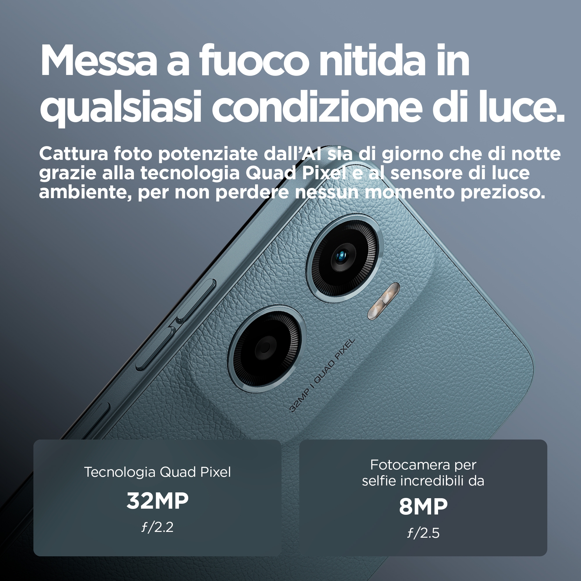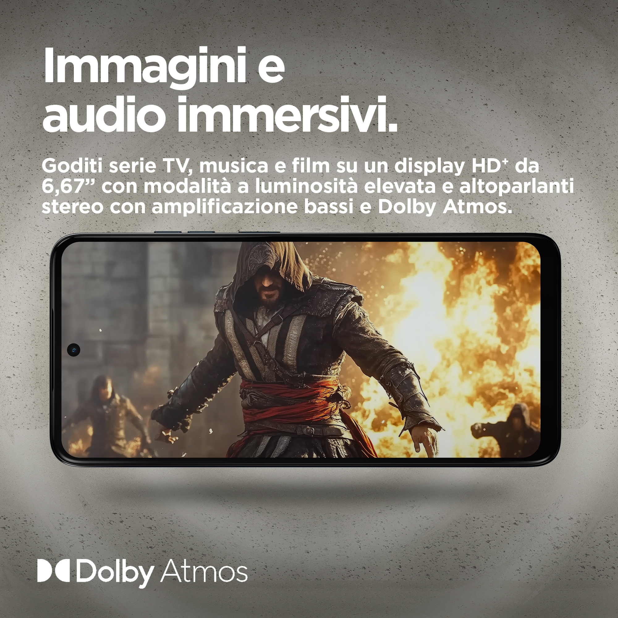 Accendi lintrattenimento<br>Fai brillare lintrattenimento con il nuovo Moto e15. Guarda i tuoi spettacoli e film preferiti sullo schermo sorprendentemente luminoso da 6,67" a 90 Hz(8), anche allaperto sotto la luce del sole. Lasciati avvolgere dal suono diffuso dai potenti altoparlanti stereo con Amplificazione bassi. Scatta foto straordinariamente nitide sia di giorno che di notte con la fotocamera Quad Pixel da 32 MP(2) dotata di funzionalità AI. Premi lacceleratore approfittando di prestazioni rapide ed efficienti e fino a 6 GB(5) di RAM grazie a Estensione RAM(4). Con la sua finitura in materiale premium vegano(3) e Corning® Gorilla® Glass 3, Moto e15 ti regala uno stile intramontabile. Lascia che il divertimento prosegua ininterrotto grazie alla batteria di lunga durata da 5200 mAh e alla ricarica TurboPower™. Illumina le tue giornate con Moto e15.