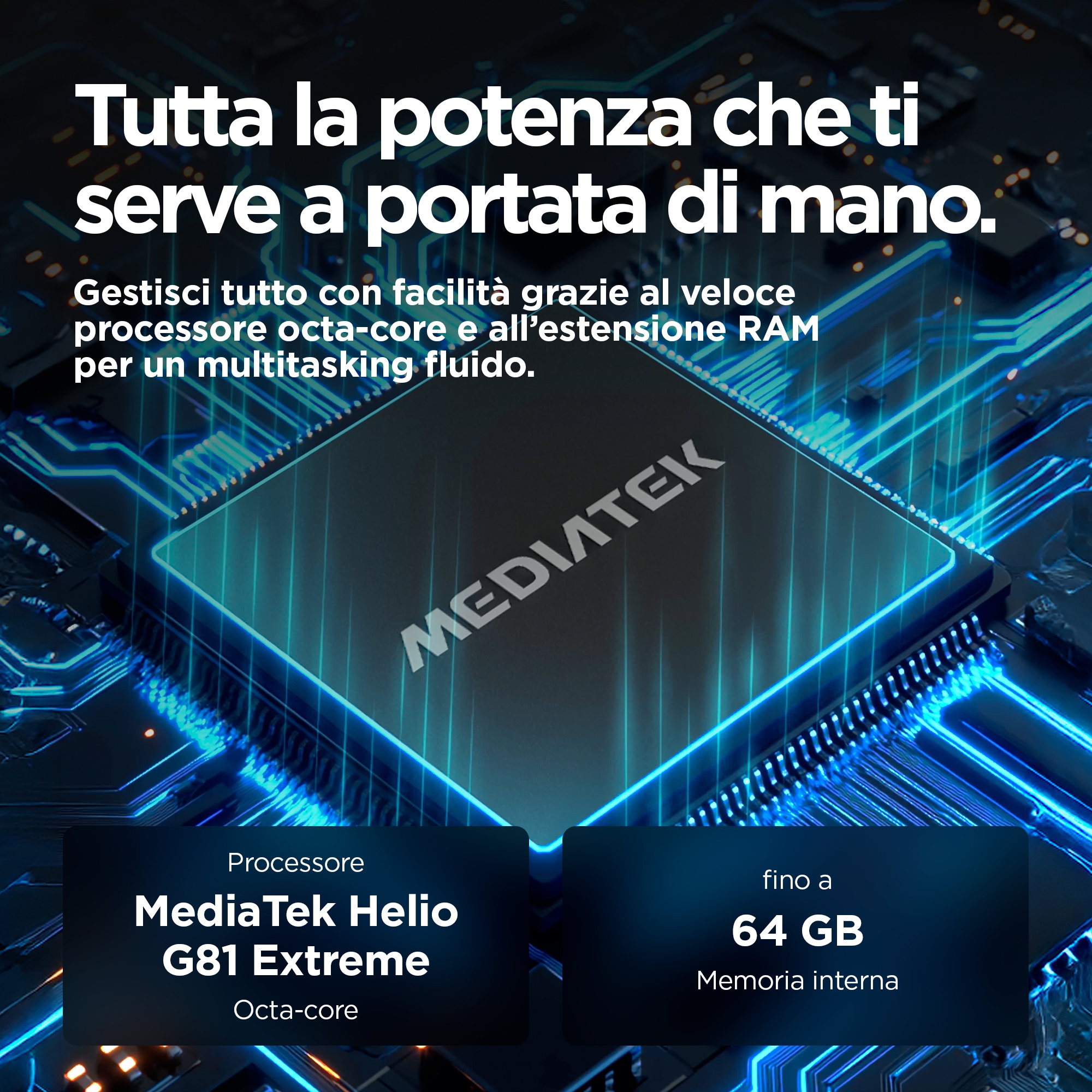 6.67", LCD, 1604 × 720px, MediaTek Helio G81 Extreme, 2GB LPDDR4X RAM, 64GB, 5200mAh, 4G, 32MP, 8MP, Bluetooth 5.4, 802.11 a/b/g/n/ac, USB Type-C 2.0, Android 14 (Go edition)