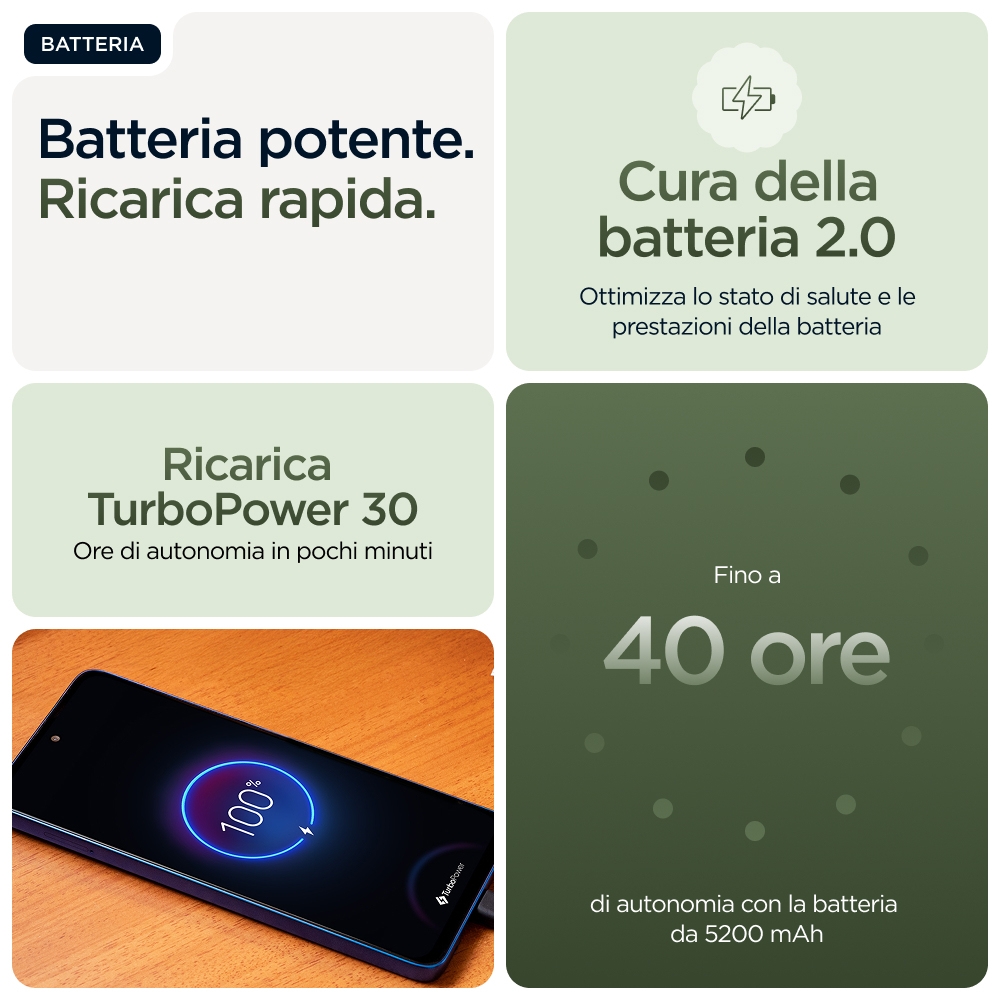 Realizzato per stregare. Progettato per durare.<br>Ti presentiamo moto g56 5G, combinazione di bellezza e robustezza. Goditi la morbidezza di una finitura premium antiscivolo, senza doverti preoccupare di nulla grazie alla protezione per limmersione in acqua, la resistenza alle temperature estreme e lo schermo resistente ai graffi.(1,2) Immergiti ancora più fondo nel tuo intrattenimento su uno schermo FHD+ da 6,72” supportato da potenti altoparlanti stereo con Amplificazione bassi. Scatta foto straordinarie in qualsiasi luce con una fotocamera Sony LYTIA™ da 50 MP gestita da Moto AI. Ottieni ore e ore di autonomia in pochi minuti con la carica TurboPower™ rapidissima.(3,4) Libera la potenza di un processore octa-core con velocità 5G.(5) Infine, approfitta di un enorme spazio di archiviazione per foto, film, canzoni e app. Il nuovo Moto g56 5G. Resistente è bello.