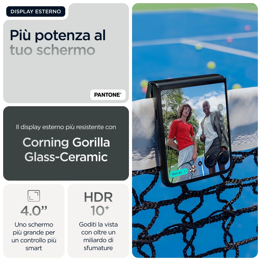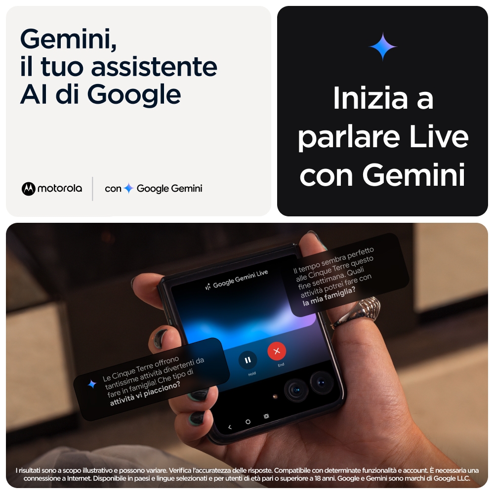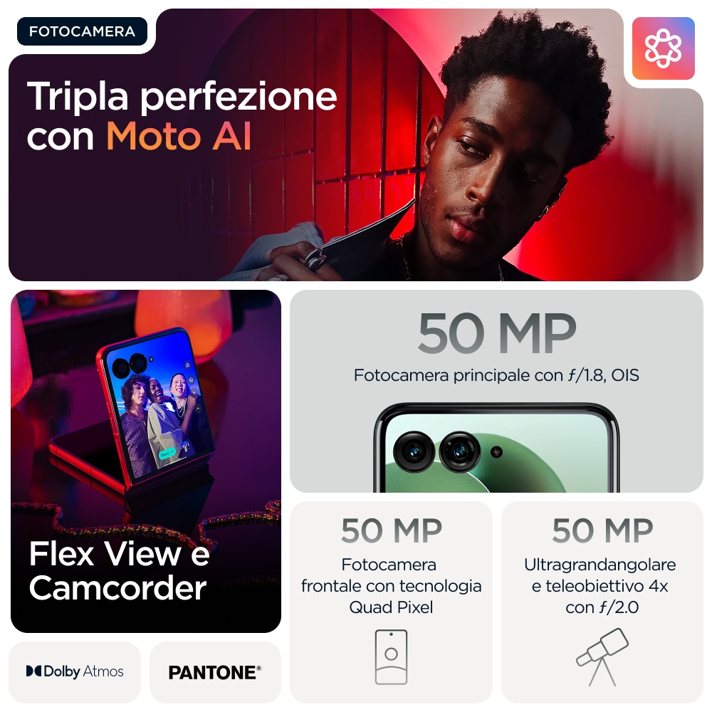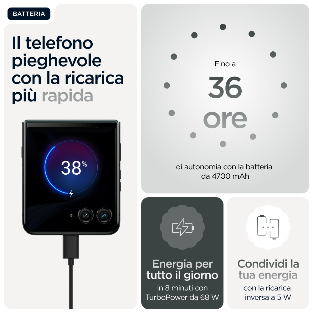 Make it iconic<br>Più smart, più veloce, ancora più iconico. Ti presentiamo Motorola Razr 60 Ultra. Ultracompatto e curato nei minimi particolari, vanta le esclusive finiture in Alcantara(43) e in vero legno, nei colori appositamente selezionati da Pantone. Accedi comodamente alle tue app preferite sul display esterno più intelligente e interattivo senza nemmeno aprire lo smartphone. Realizza foto e video di livello professionale e ottieni assistenza personalizzata grazie alla perfetta integrazione con Moto AI(1). Goditi prestazioni accelerate con le avanzatissime funzionalità AI di Snapdragon®. Ricarica in tempi record per uno smartphone pieghevole(2) grazie a TurboPower™ da 68 W. Nuovo Motorola Razr 60 Ultra. Make it yours