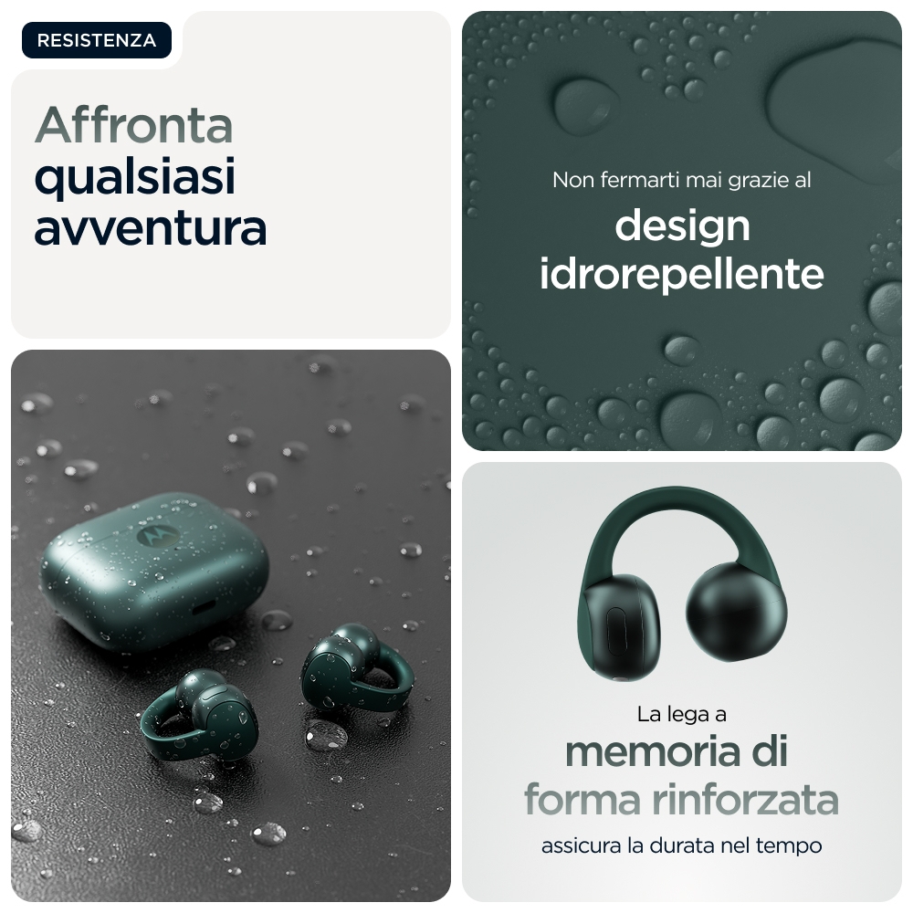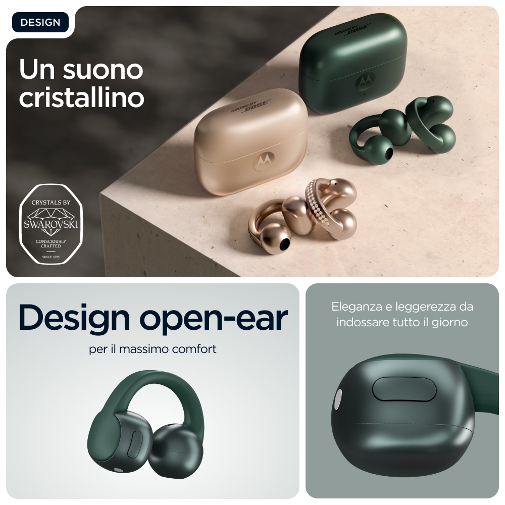 Sintonizzati con il tuo mondo<br>Ti presentiamo Moto Buds Loop, gli auricolari eleganti e leggeri progettati per migliorare la tua esperienza audio mantenendola connessa al mondo che ti circonda. Grazie al design open-ear, il modello Moto Buds Loop vanta il look che desideri, ma con il comfort per tutto il giorno di cui hai assolutamente bisogno. Mantieni il controllo della tua giornata frenetica senza perdere alcun dettaglio associando gli auricolari a dispositivi con tecnologia Moto AI.(1) Ascolta con suoni incredibilmente chiari e bilanciati grazie a Sound by Bose. Prova chiamate cristalline con il sistema di microfoni avanzato. E ottieni protezione costante grazie ai materiali premium e al design idrorepellente.(2) Con autonomia senza interruzioni fino a 8 ore(3) e ancora di più tramite la custodia, hai tutta la potenza che ti serve. Gli auricolari Moto Buds Loop sono sempre in sintonia con te.