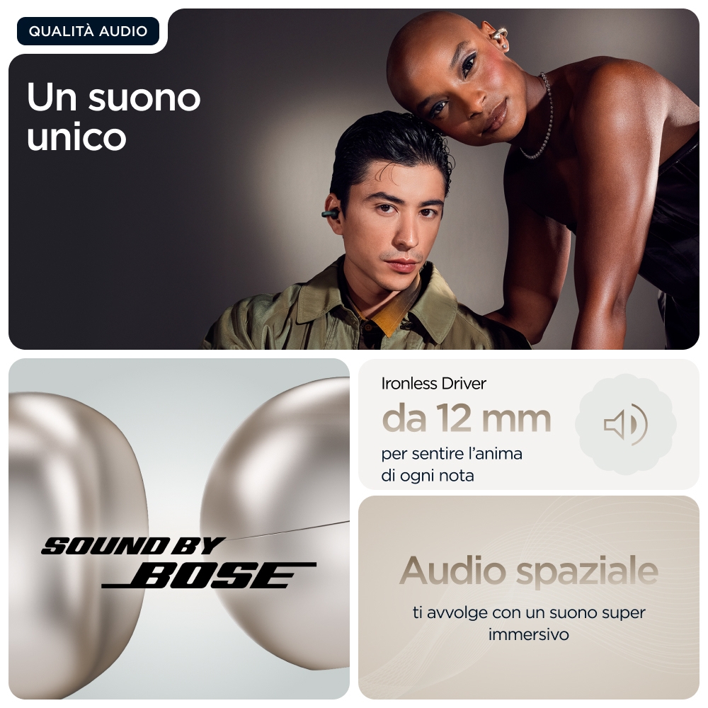 Sintonizzati con il tuo mondo<br>Ti presentiamo Moto Buds Loop, gli auricolari eleganti e leggeri progettati per migliorare la tua esperienza audio mantenendola connessa al mondo che ti circonda. Grazie al design open-ear, il modello Moto Buds Loop vanta il look che desideri, ma con il comfort per tutto il giorno di cui hai assolutamente bisogno. Mantieni il controllo della tua giornata frenetica senza perdere alcun dettaglio associando gli auricolari a dispositivi con tecnologia Moto AI.(1) Ascolta con suoni incredibilmente chiari e bilanciati grazie a Sound by Bose. Prova chiamate cristalline con il sistema di microfoni avanzato. E ottieni protezione costante grazie ai materiali premium e al design idrorepellente.(2) Con autonomia senza interruzioni fino a 8 ore(3) e ancora di più tramite la custodia, hai tutta la potenza che ti serve. Gli auricolari Moto Buds Loop sono sempre in sintonia con te.