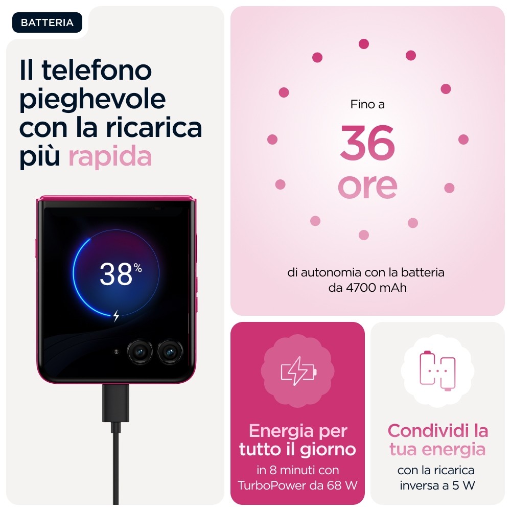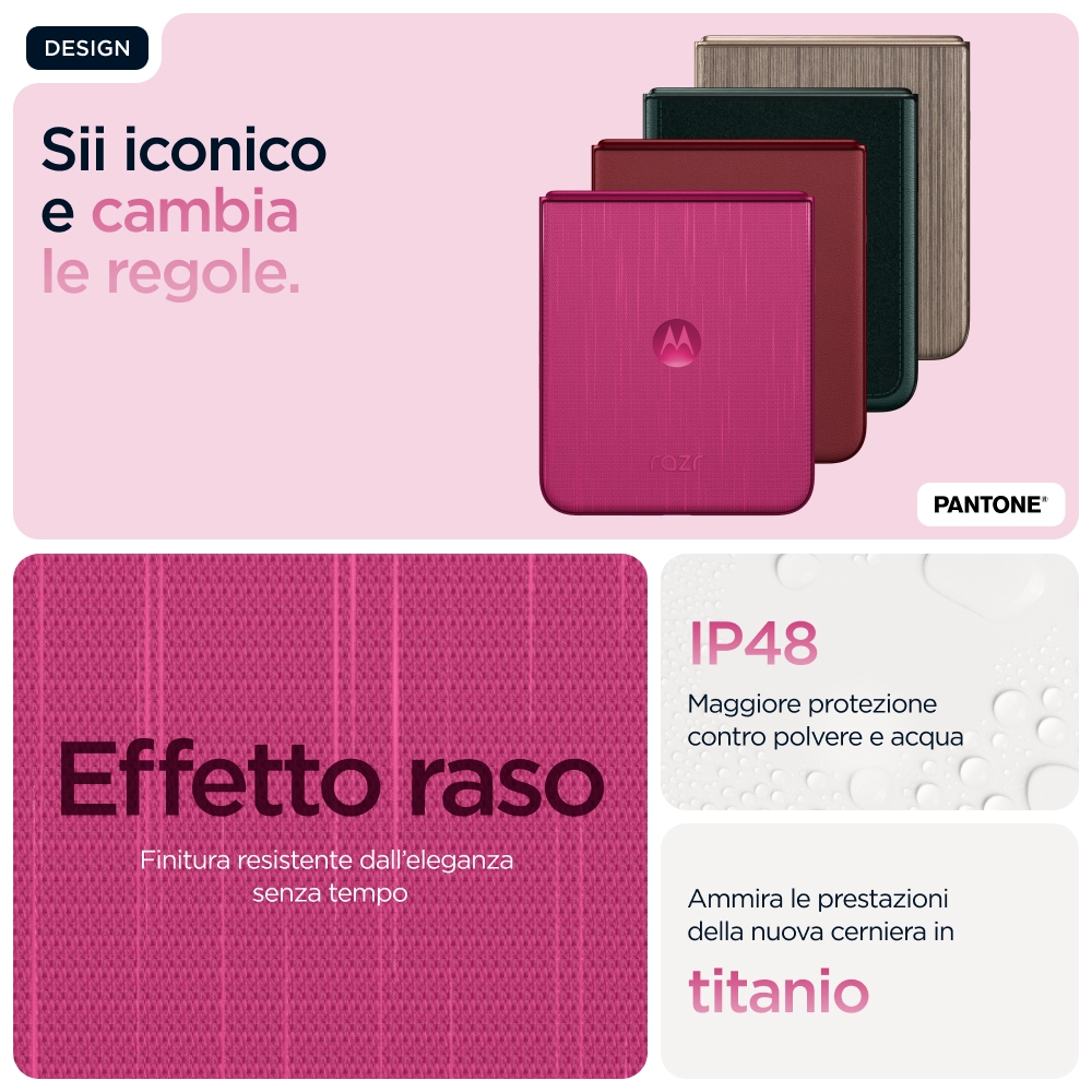 Make it iconic<br>Più smart, più veloce, ancora più iconico. Ti presentiamo Motorola Razr 60 Ultra. Ultracompatto e curato nei minimi particolari, vanta le esclusive finiture in Alcantara(43) e in vero legno, nei colori appositamente selezionati da Pantone. Accedi comodamente alle tue app preferite sul display esterno più intelligente e interattivo senza nemmeno aprire lo smartphone. Realizza foto e video di livello professionale e ottieni assistenza personalizzata grazie alla perfetta integrazione con Moto AI(1). Goditi prestazioni accelerate con le avanzatissime funzionalità AI di Snapdragon®. Ricarica in tempi record per uno smartphone pieghevole(2) grazie a TurboPower™ da 68 W. Nuovo Motorola Razr 60 Ultra. Make it yours