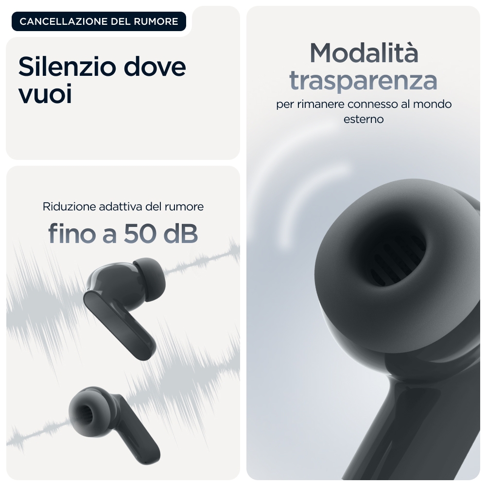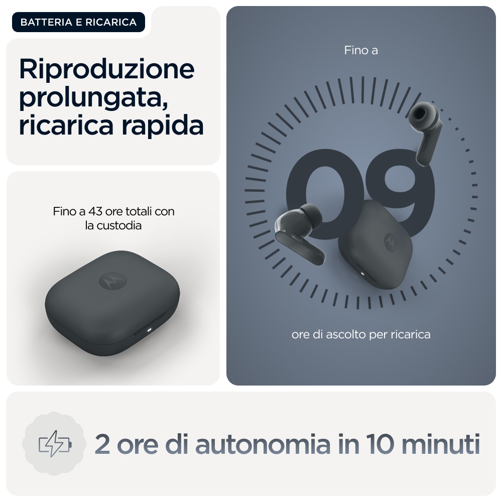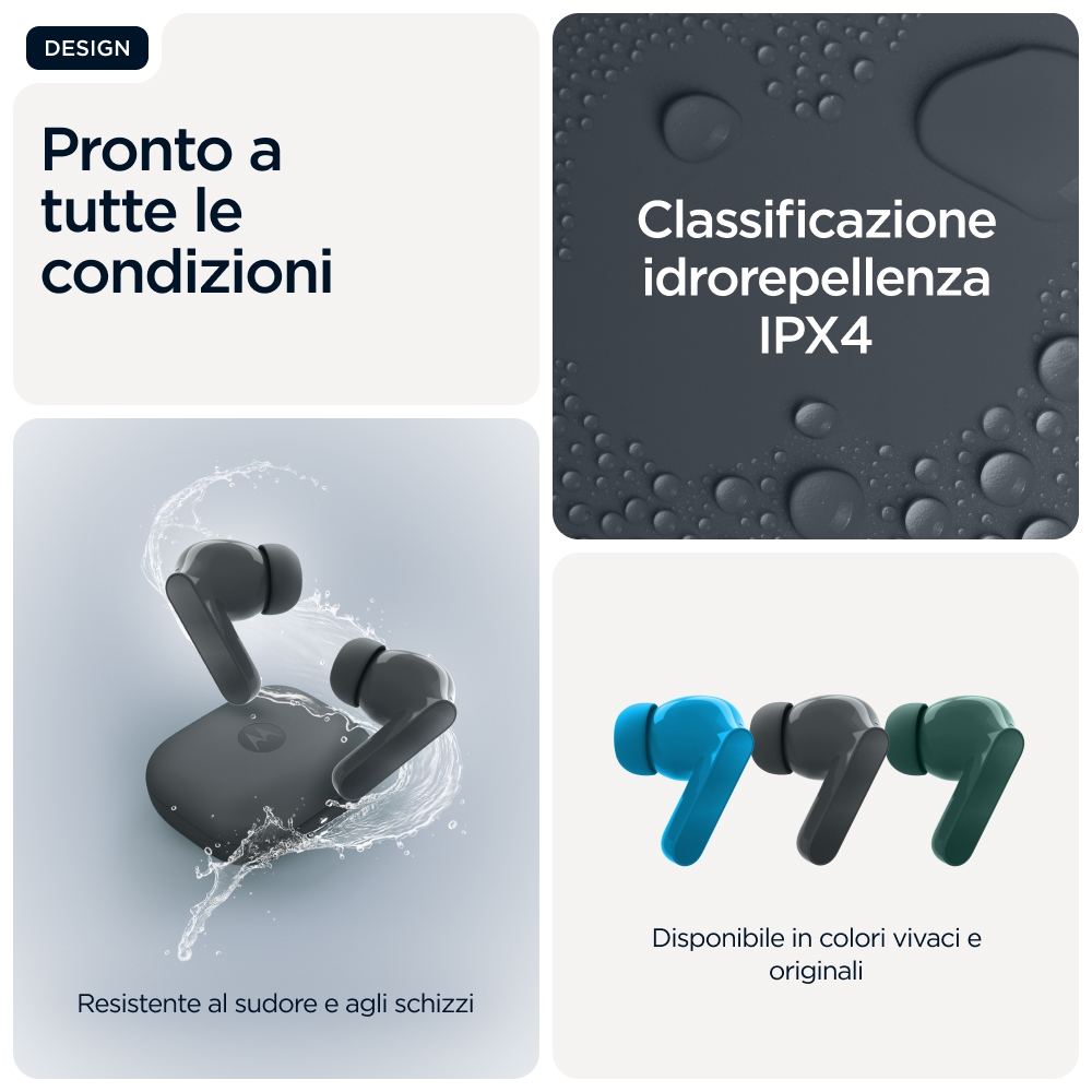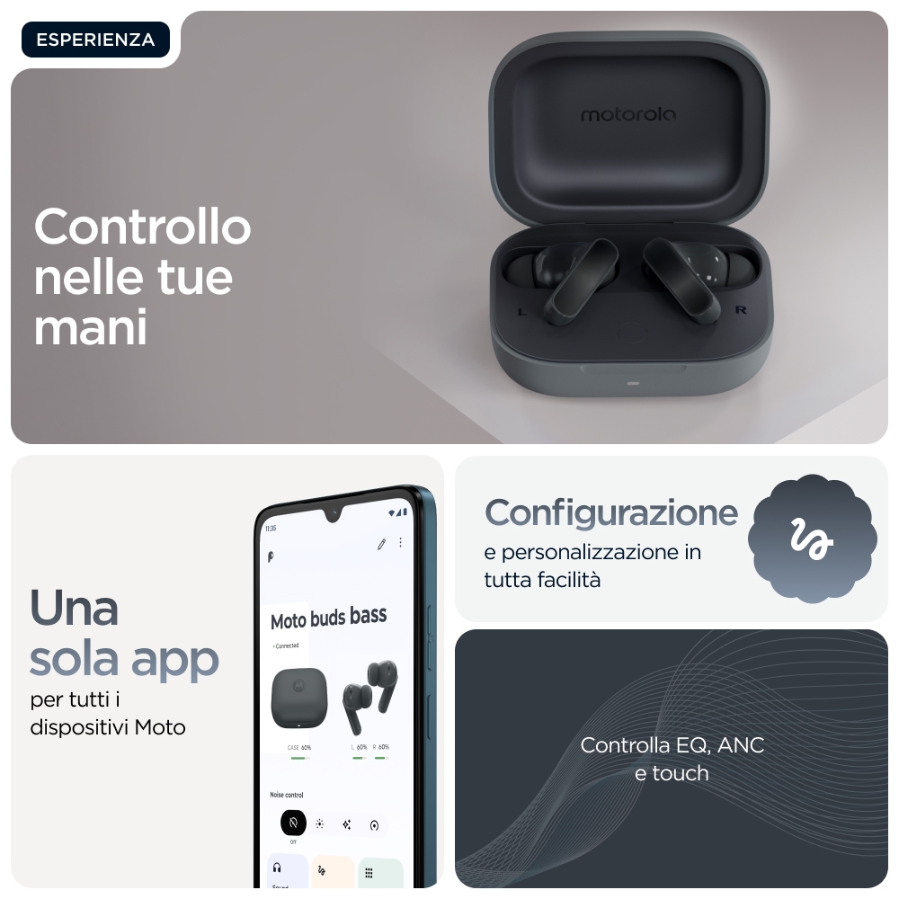 Bassi potenti che puoi sentire.<br>Che si tratti del drop nel tuo brano preferito o del ritmo che ti tiene in movimento, il basso è qualcosa che dovresti sentire. Motorola presenta i moto buds bass, con un ampio driver dinamico appositamente ottimizzato per bassi profondi e potenti e audio ad alta risoluzione.(1) Immergiti nella musica e nei film con un audio profondo e di impatto e bassi ricchi che animano ogni beat. Escludi il mondo attorno a te o mantieni la percezione dellambiente che ti circonda durante lascolto con leliminazione attiva e dinamica del rumore. Goditi chiamate vocali cristalline grazie al sistema con tre microfoni su ogni auricolare. Personalizza e controlla facilmente la tua esperienza di ascolto con lapp Moto Buds.(8) Oltre a tutto ciò, infinite ore di autonomia, ricarica rapida e design idrorepellente.(2) Senti il ritmo prendere vita con i moto buds bass.