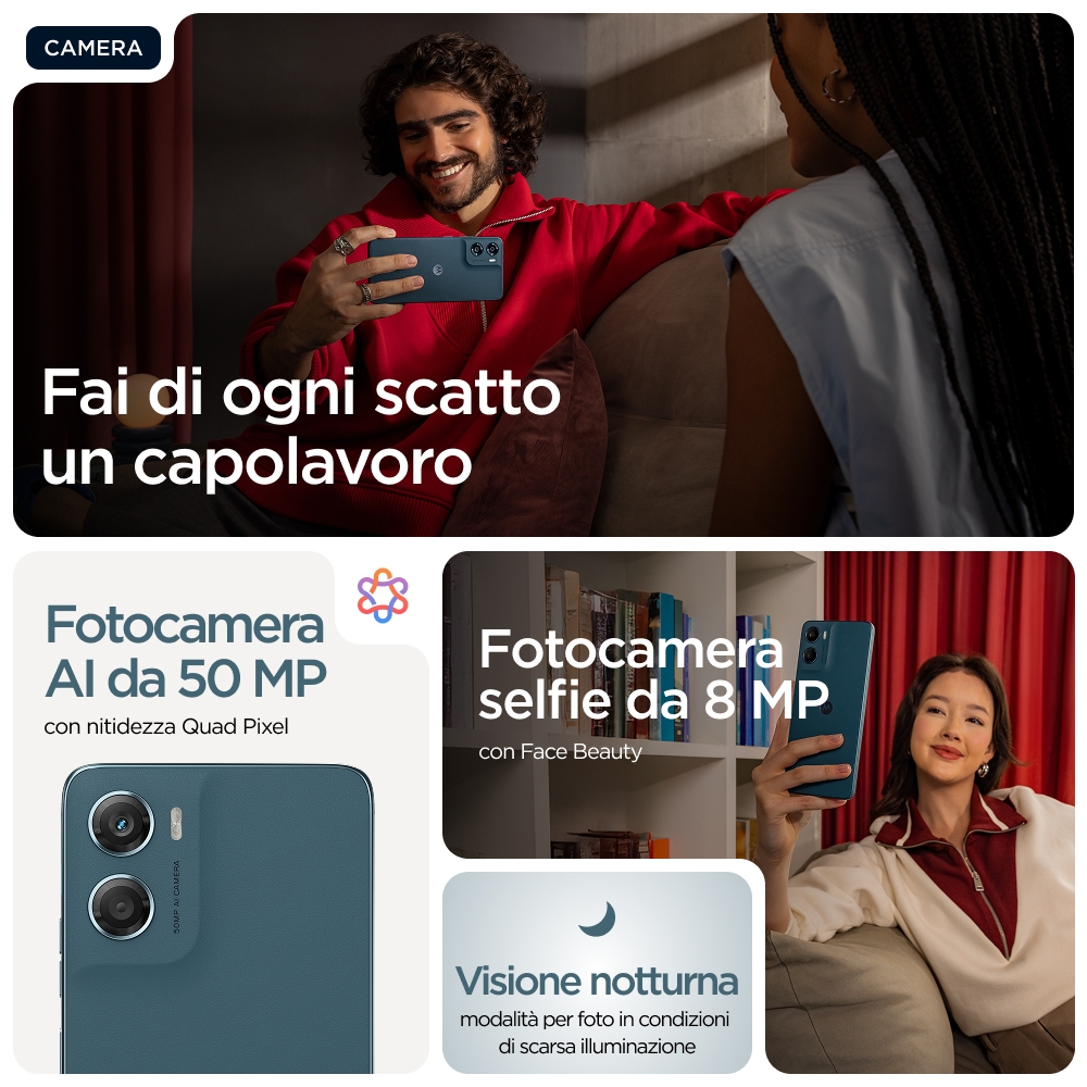 Valore in tasca<br>Ecco moto g06, un telefono progettato per andare oltre le tue aspettative. Guarda i tuoi programmi e film preferiti su un ampio e luminoso display 6,88", il nostro più grande di sempre su moto g, con altoparlanti stereo e audio Dolby Atmos®. Scatta foto straordinarie con qualsiasi condizione di luce utilizzando un sistema di fotocamere da 50 MP con tecnologia AI.(1) Ottieni multitasking super efficiente con fino a 12 GB di RAM utilizzando RAM Boost.(2,5,6,10) Goditi la tranquillità grazie alle caratteristiche di resistenza avanzata e a un design premium, che include la protezione dallacqua IP64(3), Corning® Gorilla® Glass 3 e finitura in materiale premium vegano. Goditi 2 giorni con una singola ricarica.(4) E vivi esperienze Moto esclusive che rendono il tuo telefono più sicuro, personale e divertente. Inoltre, cerca immediatamente tutto ciò che vedi sul tuo telefono con Cerchia per cercare. Ottieni di più con moto g06.