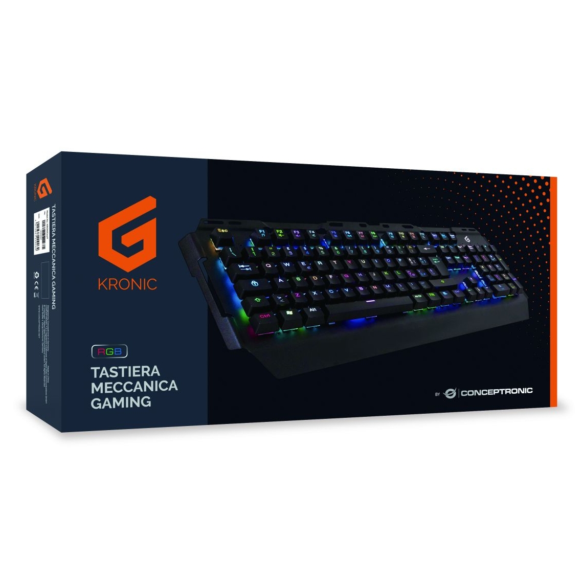 Conceptronic KRONIC. Fattore di forma tastiera: Full-size (100%). Stile tastiera: Dritto. Tecnologia di connessione: Cablato, Interfaccia dispositivo: USB, Interruttore a chiave per tastiera: Interruttore a chiave meccanica, Struttura tastiera: QWERTY, Numero pulsanti tastiera: 105. Tipologia di retroilluminazione: LED RGB. Lunghezza cavo: 1,8 m. Utilizzo raccomandato: Gaming. Colore del prodotto: Nero
