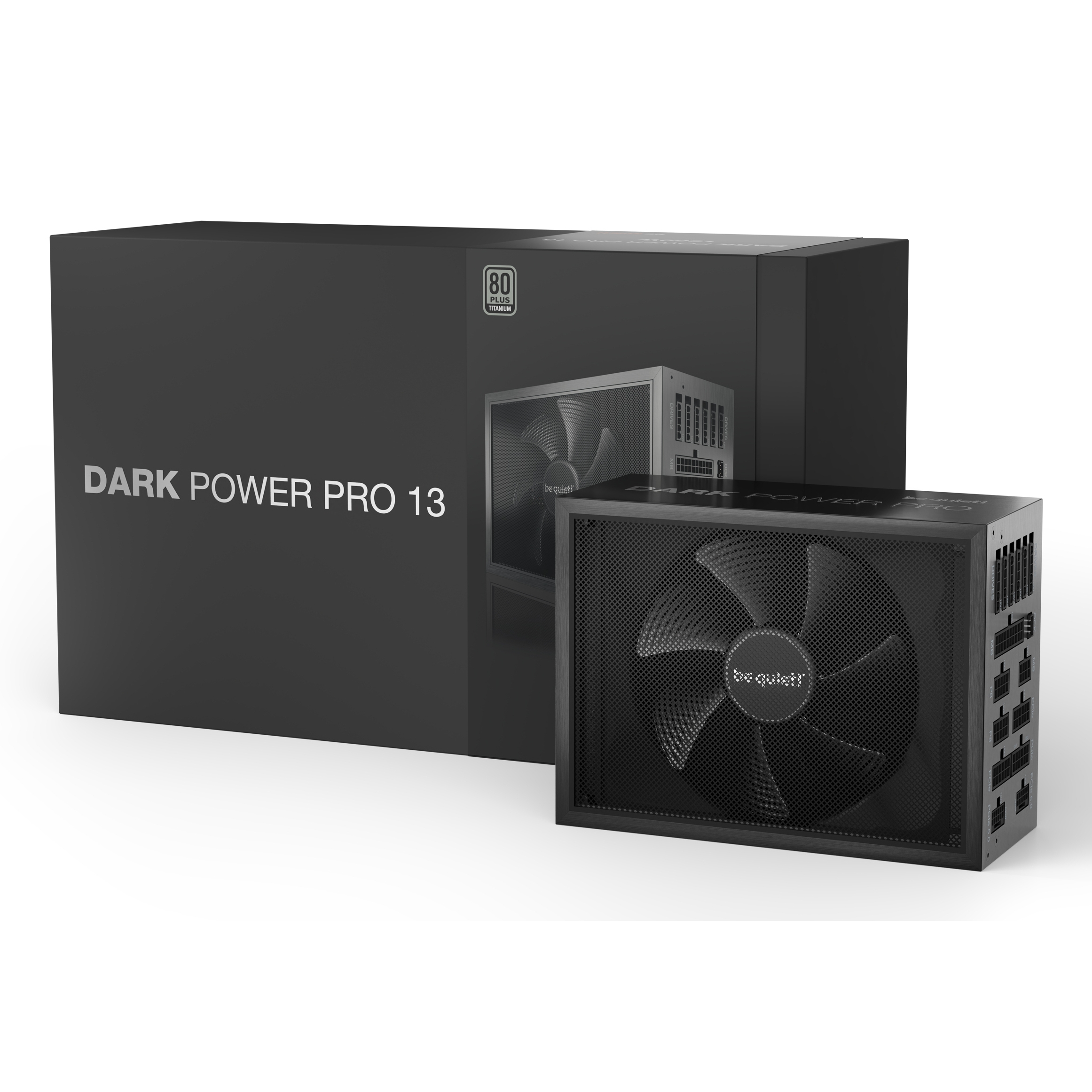 Be quiet! Dark Power Pro 13 | 1300W. Potenza totale: 1300 W, Tensione di ingresso AC: 115 - 240 V, Potenza di picco: 1400 W. Connettore scheda madre: 20+4 pin ATX, Lunghezza del cavo di alimentazione della scheda madre: 60 cm, Lunghezza del cavo di alimentazione SATA: 500,600,750,800,900,950,1050 mm. Utilizzo: PC, Fattore di forma dell'unità di alimentazione (PSU): ATX, Certificazione 80 PLUS: 80 PLUS Titanium. Colore del prodotto: Nero, Tipo di raffreddamento: Attivo, Diametro del ventilatore: 13,5 cm. Cavi inclusi: CPU, PCIe, Peripheral (Molex), SATA