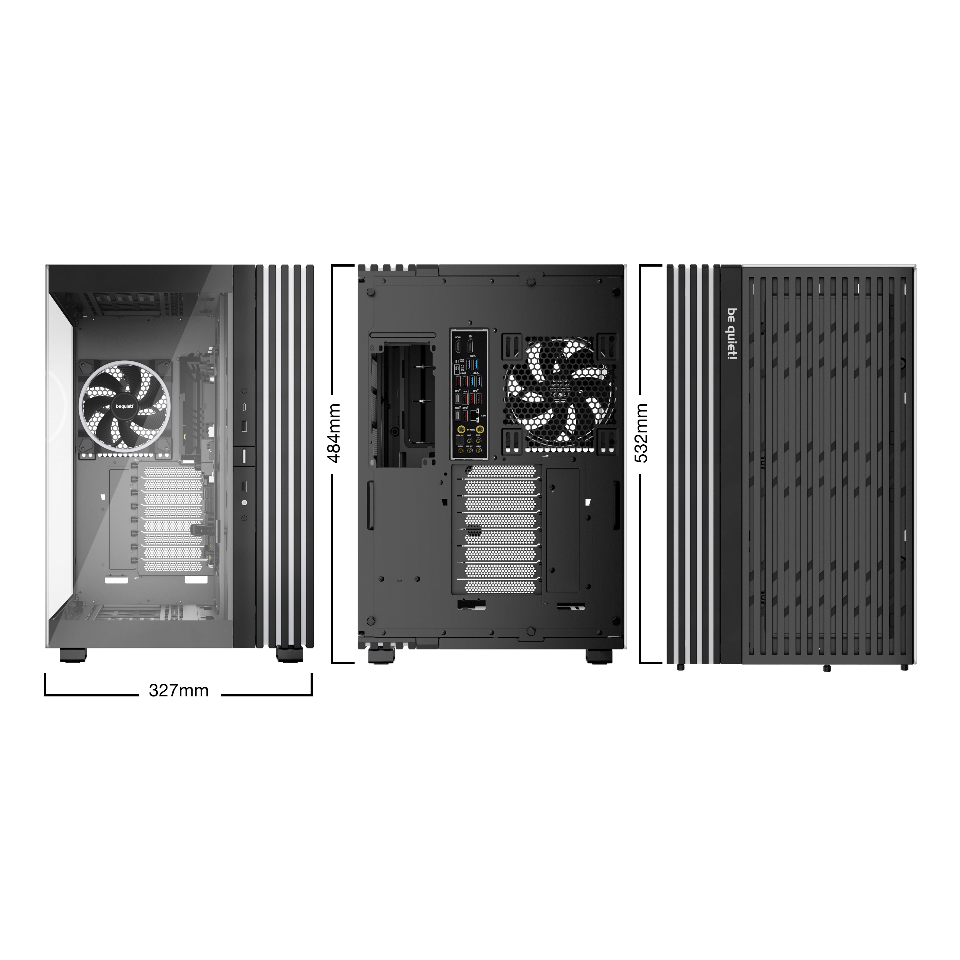 Be quiet! LIGHT BASE 900 FX Black. Fattore di forma: Full Tower, Tipo: PC, Colore del prodotto: Nero. Fattori di forma di alimentazione supportati: ATX, PS2. Ventole laterali installate: 3x 140 mm, Diametro delle ventole laterali supportato: 120,140 mm, Rear fans installed: 1x 140 mm. Dimensioni di hard disk drive supportati: 2.5,3.5". Larghezza: 327 mm, Profondità: 532 mm, Altezza: 484 mm