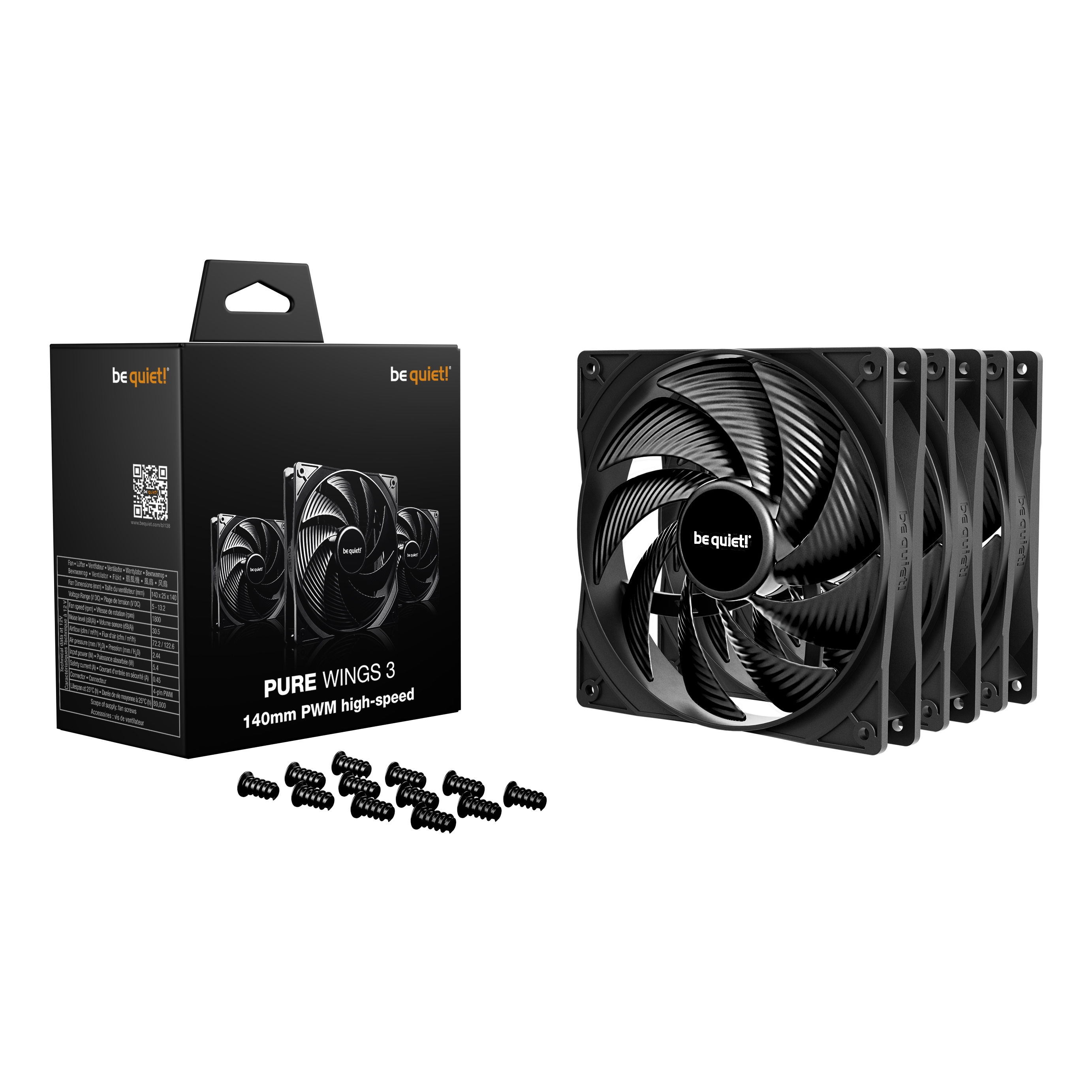 Be quiet! Pure Wings 3 140mm | PWM high-speed Triple Pack. Tipo: Ventilatore, Diametro del ventilatore: 14 cm, Velocità (massima) di rotazione: 1800 Giri/min, Flusso d'aria: 122,6 m³/h, pressione dell'aria massima: 2,44 mmH2O, Tipo di cuscinetto: Cuscinetto da strisciamento. Voltaggio: 5 - 13.2 V. Colore del prodotto: Nero