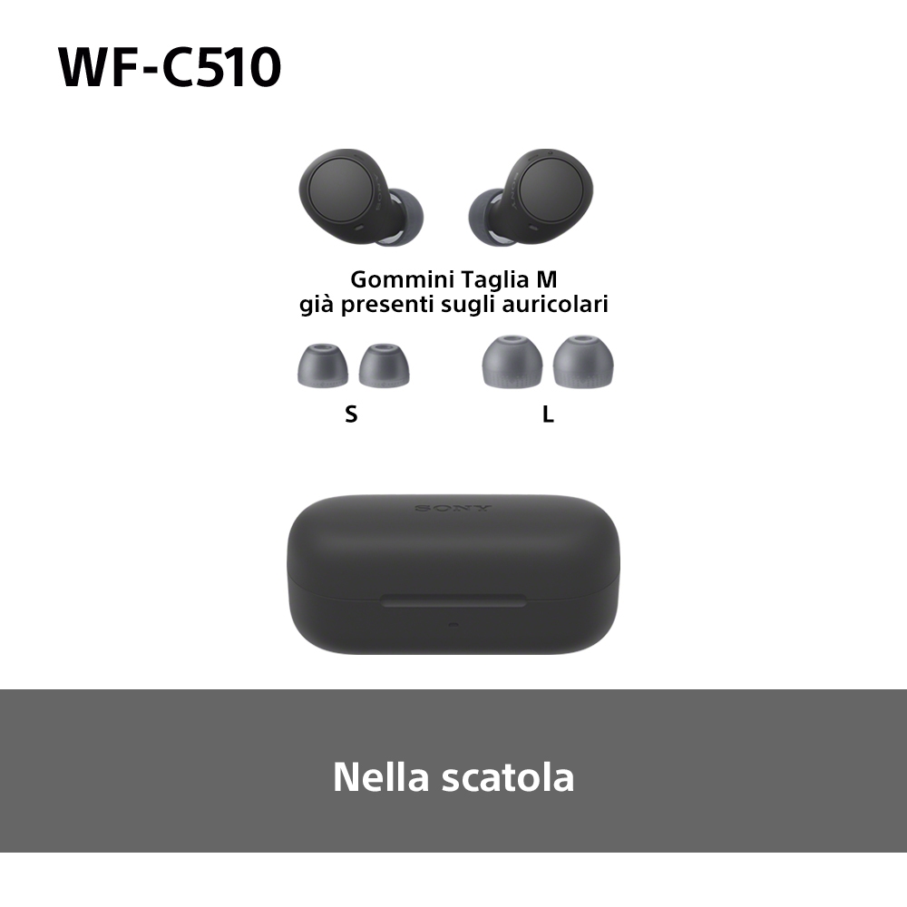 Sony WF-C510 | Cuffie True Wireless - Suono di alta qualità, Equalizzatore personalizzabile, Design Confortevole, Batteria da 22 ore, Ricarica Rapida, Connessione Multipoint Bluetooth, Ambient Sound Mode, Spotify Tap, Classificazione IPX4 - Nero. Tipo di prodotto: Auricolare. Tecnologia di connessione: True Wireless Stereo (TWS), Bluetooth. Utilizzo raccomandato: Chiamate/Musica/Sport/Tutti i giorni. Range wireless: 10 m. Peso: 31 g. Colore del prodotto: Nero