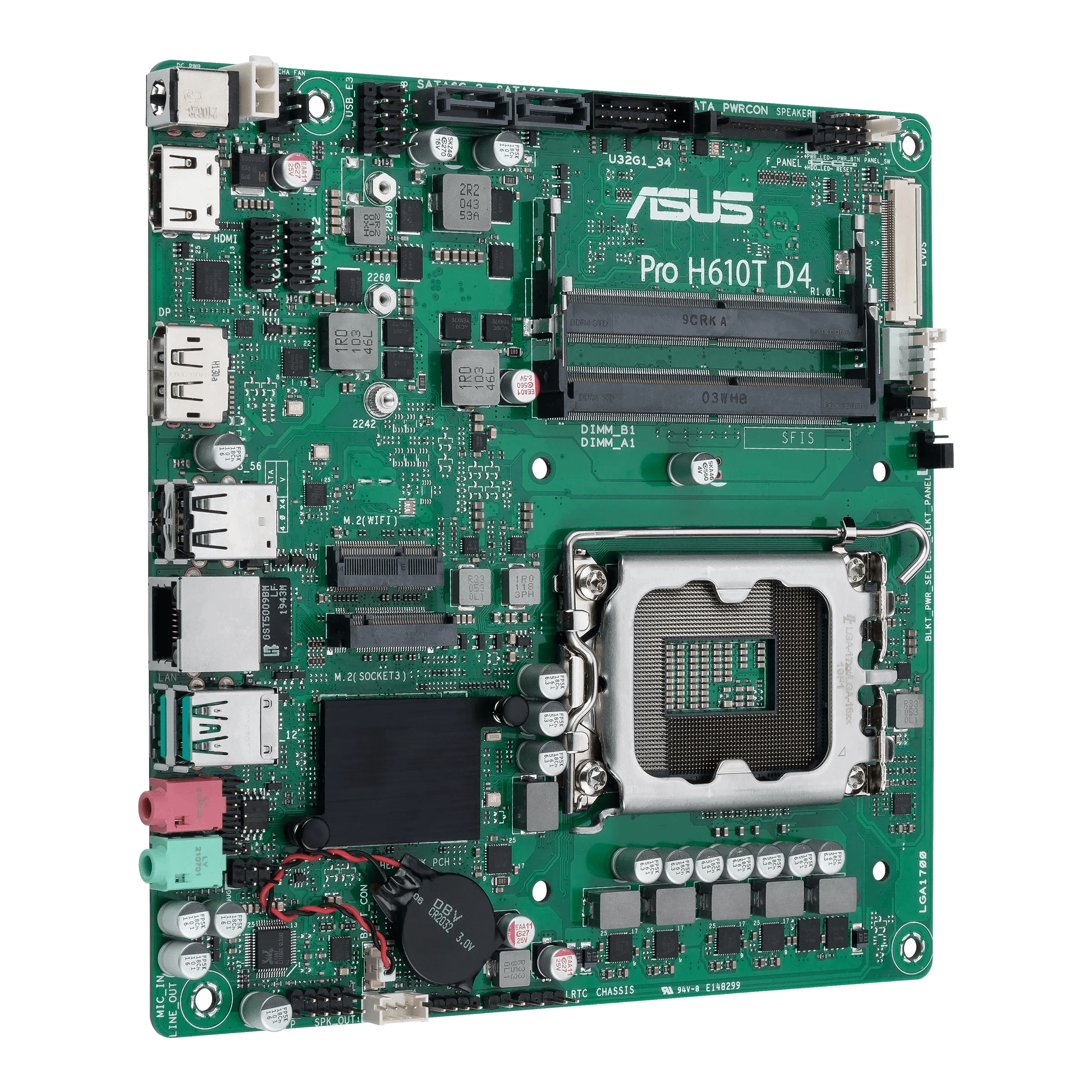 ASUS Pro H610T D4-CSM. Produttore processore: Intel, Presa per processore: LGA 1700, Processori compatibili: Intel® Celeron®, Intel® Core™ i3, Intel® Core™ i5, Intel® Core™ i7, Intel® Core™ i9, Intel® Pentium®. Tipi di memoria supportati: DDR4-SDRAM, RAM massima supportata: 64 GB, tipo di slot di memoria: SO-DIMM. Interfacce dell'unità di archiviazione supportate: M.2, SATA III, Tipi di unità di archiviazione supportate: HDD & SSD. Tipo di interfaccia Ethernet: Gigabit Ethernet. Componente per: PC, Fattore di forma scheda madre: mini ITX, Famiglia di chipset per scheda madre: Intel