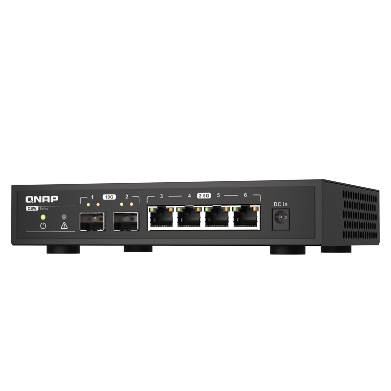 Il QSW-2104-2S è uno switch non gestito facile da usare con 2 porte 10GbE SFP+ e 4 porte 2,5GbE RJ45, che consentono di aggiornare l’ambiente di rete collegando un’ampia gamma di dispositivi con diversi requisiti di banda. Dotato di un design senza ventole a basso rumore e conforme con IEEE 802.3az (Energy Efficient Ethernet, EEE), il QSW-2104-2S è silenzioso oltre a offrire un uso ottimale dell’alimentazione. Grazie a prestazioni elevate e superbe funzionalità, il QSW-2104-2S è la scelta ideale per la creazione di un ambiente di rete ad alta velocità affidabile a casa ed al lavoro.<br><br>Massima flessibilità con più porte Ethernet 10G e 2,5G<br><br>Il QSW-2104-2S dispone di porte 10GbE SFP+ e 2,5GbE RJ45 per il collegamento di diversi dispositivi a richiesta elevata di banda. Con le interfacce SFP+, è possibile usare il collegamento direct attach copper (DAC) per il collegamento diretto ai dispositivi SFP+. Con il QSW-2104-2S, è possibile creare in modo semplice una rete ibrida ad alta velocità a casa ed in ufficio per accelerare il trasferimento dei file, applicazioni di macchine virtuali, trasmissione/condivisione multimediale e altro.<br><br>Ambiente di rete del futuro<br><br>QNAP offre soluzioni di archiviazione e di rete complete ed economiche per una vasta serie di possibili connettività. E’ possibile aggiornare in modo semplice e flessibile la rete domestica o aziendale per gestire applicazioni esigenti in termini di banda.<br><br>Plug & play. Auto negoziazione per velocità di connessione ottimali.<br><br>Non sono necessarie complesse impostazioni per usare il QSW-2104-2S, è sufficiente collegare il dispositivo per iniziare ad utilizzarlo. Il QSW-2104-2S supporta l’auto negoziazione che ottimizza le velocità di trasferimento e le prestazioni di ciascun dispositivo collegato.<br><br>Rilevamento e blocco dei loop<br><br>Il QSW-2104-2S dispone del rilevamento dei loop. Quando viene rilevato un loop di rete, il QSW-2104-2S blocca automaticamente le porte in loop per garantire una ripresa rapida delle normali operazioni dell’ambiente di rete.<br><br>Elevata silenziosità ed efficienza energetica<br><br>Il QSW-2104-2S dispone di un design senza ventole per operazioni silenziose. La particolare costruzione ventilata garantisce il raffreddamento conservando allo stesso tempo prestazioni elevate e mantenendo l’ambiente silenzioso. Il supporto IEEE 802.3az (EEE) riduce inoltre il consumo energetico senza sacrificare le prestazioni o le funzionalità.