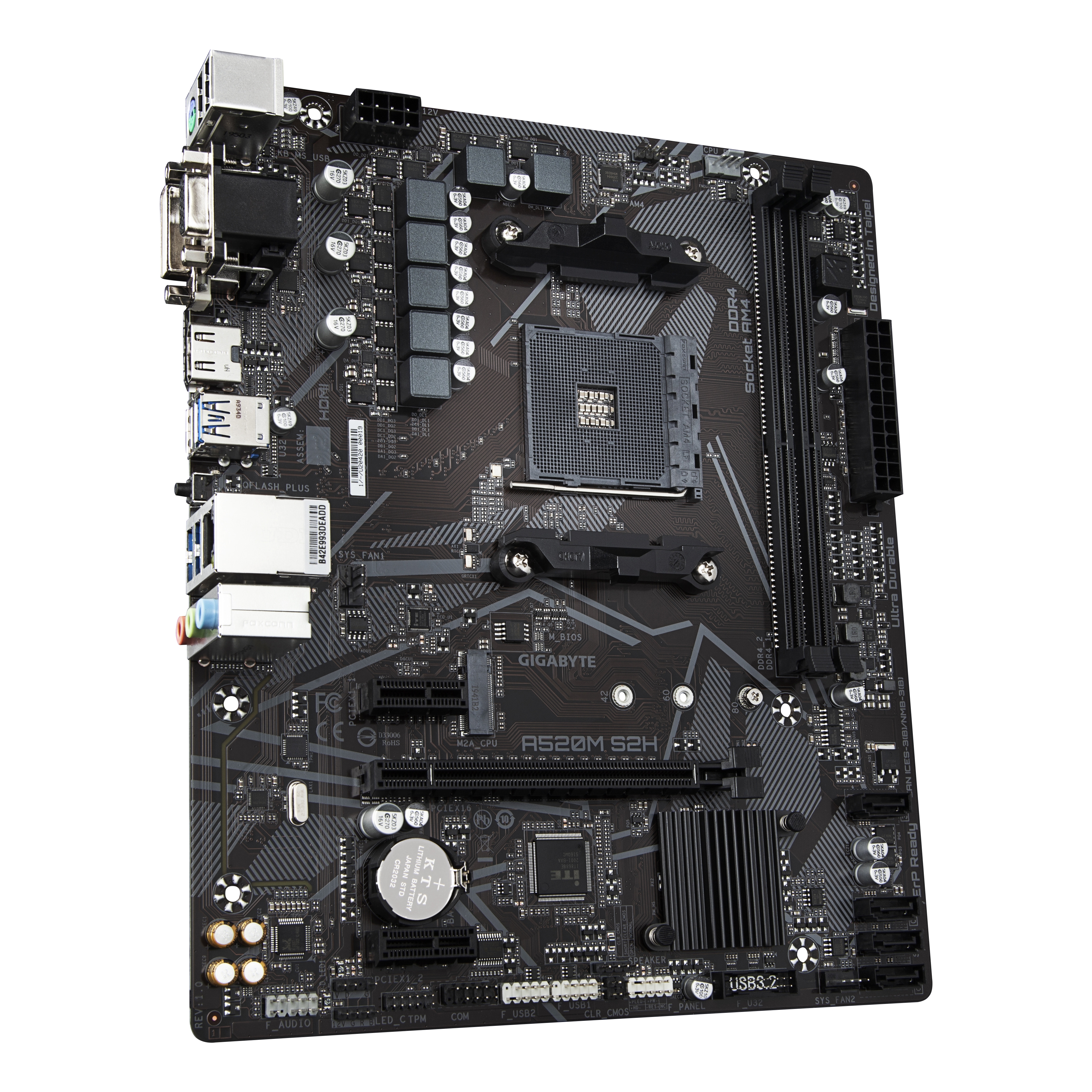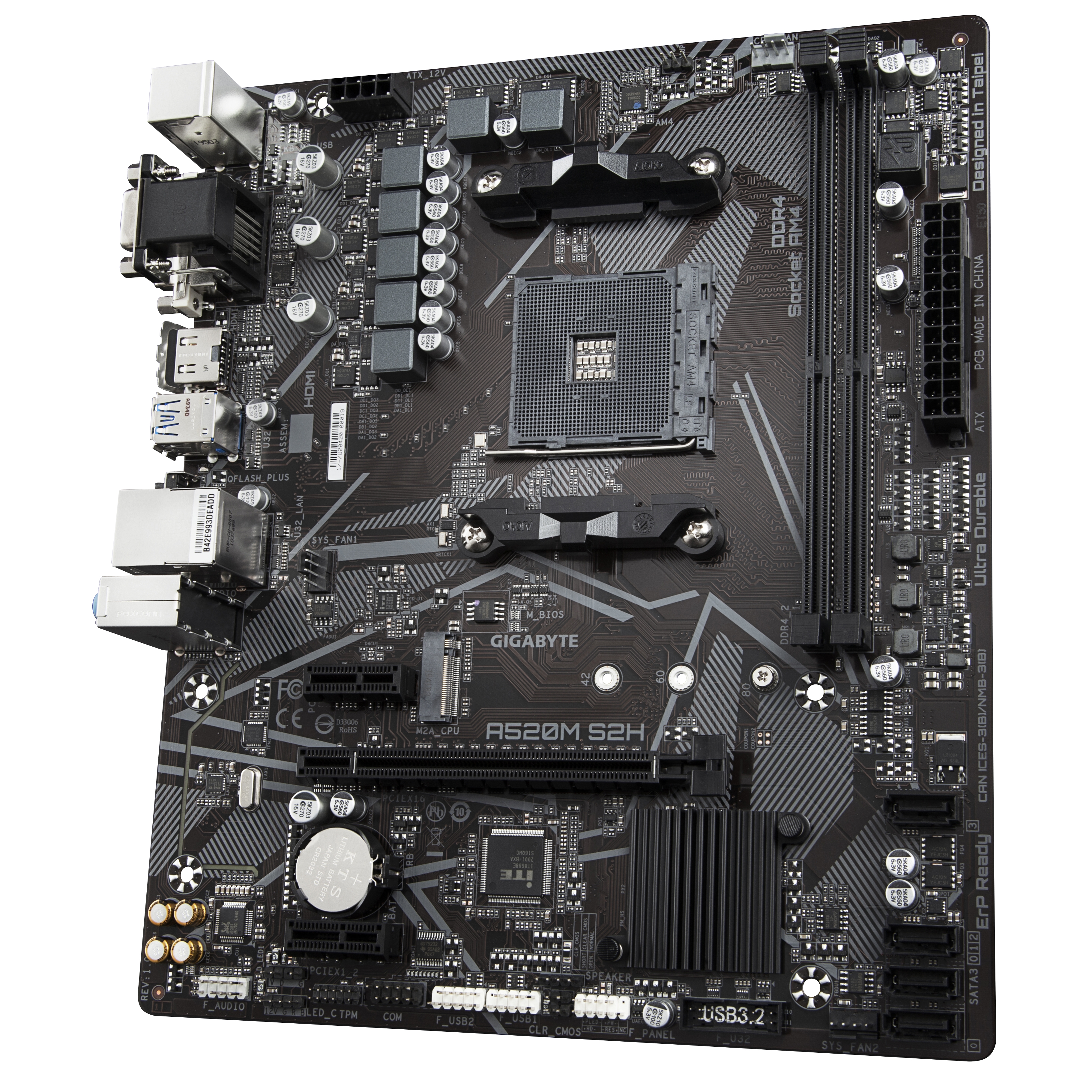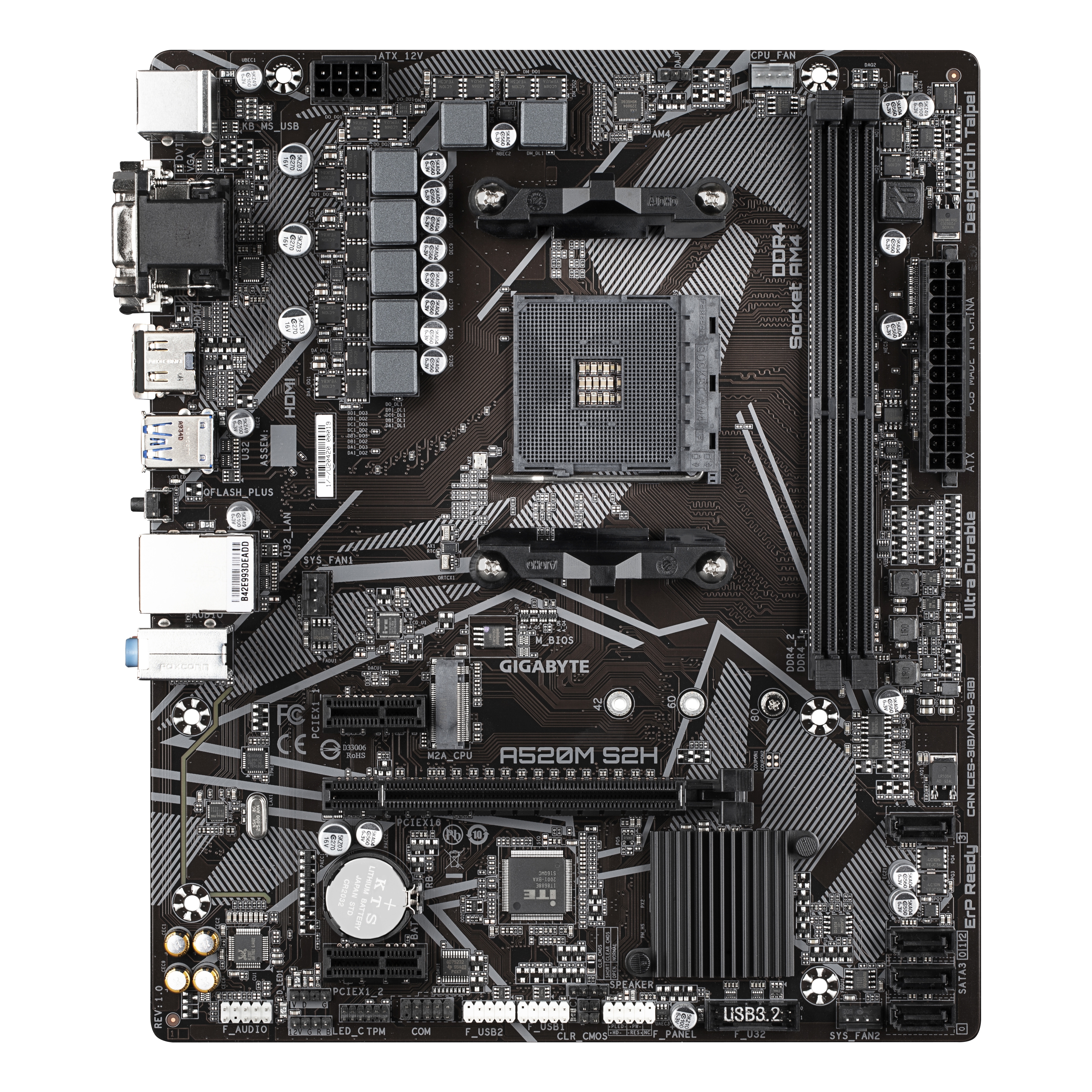 GIGABYTE Scheda madre A520M S2H - Supporta CPU AMD Ryzen serie 5000 AM4, VRM digitale puro 4+3 fasi, fino a 5100MHz DDR4 (OC), PCIe 3.0 x4 M.2, LAN GbE, USB 3.2 Gen 1. Produttore processore: AMD, Presa per processore: Socket AM4, Processori compatibili: AMD Ryzen 3000 Series. Tipi di memoria supportati: DDR4-SDRAM, RAM massima supportata: 64 GB, tipo di slot di memoria: DIMM. Interfacce dell'unità di archiviazione supportate: M.2, PCI Express 3.0, SATA, Livelli RAID: 0, 1, 10. Tipo di interfaccia Ethernet: Gigabit Ethernet. Componente per: PC, Fattore di forma scheda madre: micro ATX, Famiglia di chipset per scheda madre: AMD
