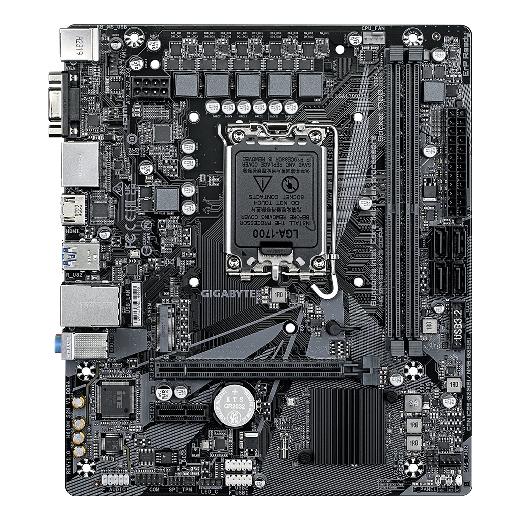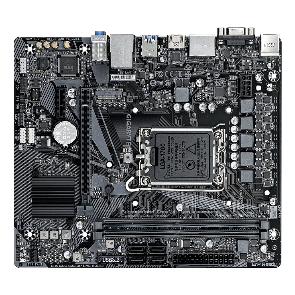 GIGABYTE H610M S2H V3 DDR4 Scheda madre - Supporta processori Intel Core 14th CPUs, 4+1+1 Hybrid Digital VRM, up to 3200MHz DDR4, 1xPCIe 3.0 M.2, GbE LAN , USB 3.2 Gen 1. Produttore processore: Intel, Presa per processore: LGA 1700, Processori compatibili: Intel® Core™ i3, Intel® Core™ i5, Intel® Core™ i7. Tipi di memoria supportati: DDR4-SDRAM, RAM massima supportata: 64 GB, tipo di slot di memoria: DIMM. Interfacce dell'unità di archiviazione supportate: M.2, SATA III, Tipi di unità di archiviazione supportate: HDD & SSD. Risoluzione massima: 4096 x 2304 Pixel. Connettore USB: USB tipo A