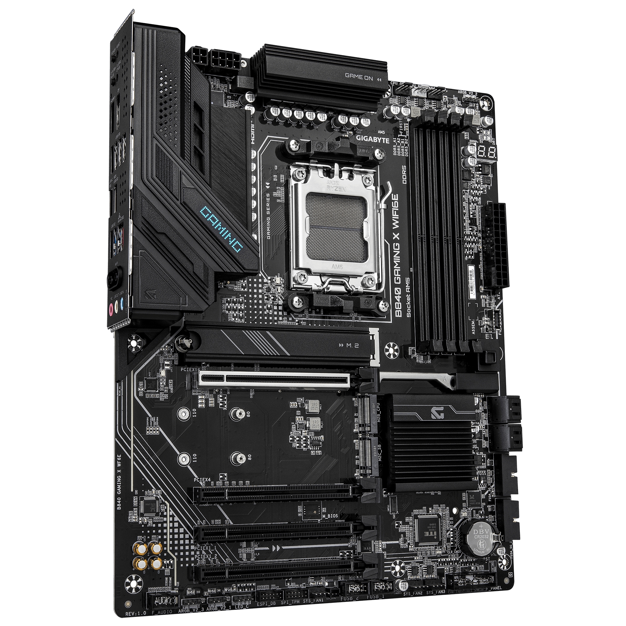 GIGABYTE B840 GAMING X WIFI6E Scheda Madre - CPU AMD Ryzen 9000, VRM 12+2+2 fasi, fino a 7600MHz DDR5(O.C), 2xPCIe 4.0 + 1xPCIe 3.0 M.2, Wi-Fi 6E, LAN 2.5GbE, USB 3.2 Gen 2. Produttore processore: AMD, Presa per processore: Socket AM5, Processori compatibili: AMD Ryzen 7000 Series, AMD Ryzen 8000 Series, AMD Ryzen 9000 Series. Tipi di memoria supportati: DDR5-SDRAM, RAM massima supportata: 256 GB, tipo di slot di memoria: DIMM. Interfacce dell'unità di archiviazione supportate: M.2, PCI Express 3.0, PCI Express 4.0, SATA III, Tipi di unità di archiviazione supportate: HDD & SSD, Livelli RAID: 0, 1, 5, 10. Risoluzione massima: 4096 x 2160 Pixel. Tipo di interfaccia Ethernet: 2.5 Gigabit Ethernet, Controller LAN: Realtek RTL8125, Wi-Fi standard: Wi-Fi 6E (802.11ax)
