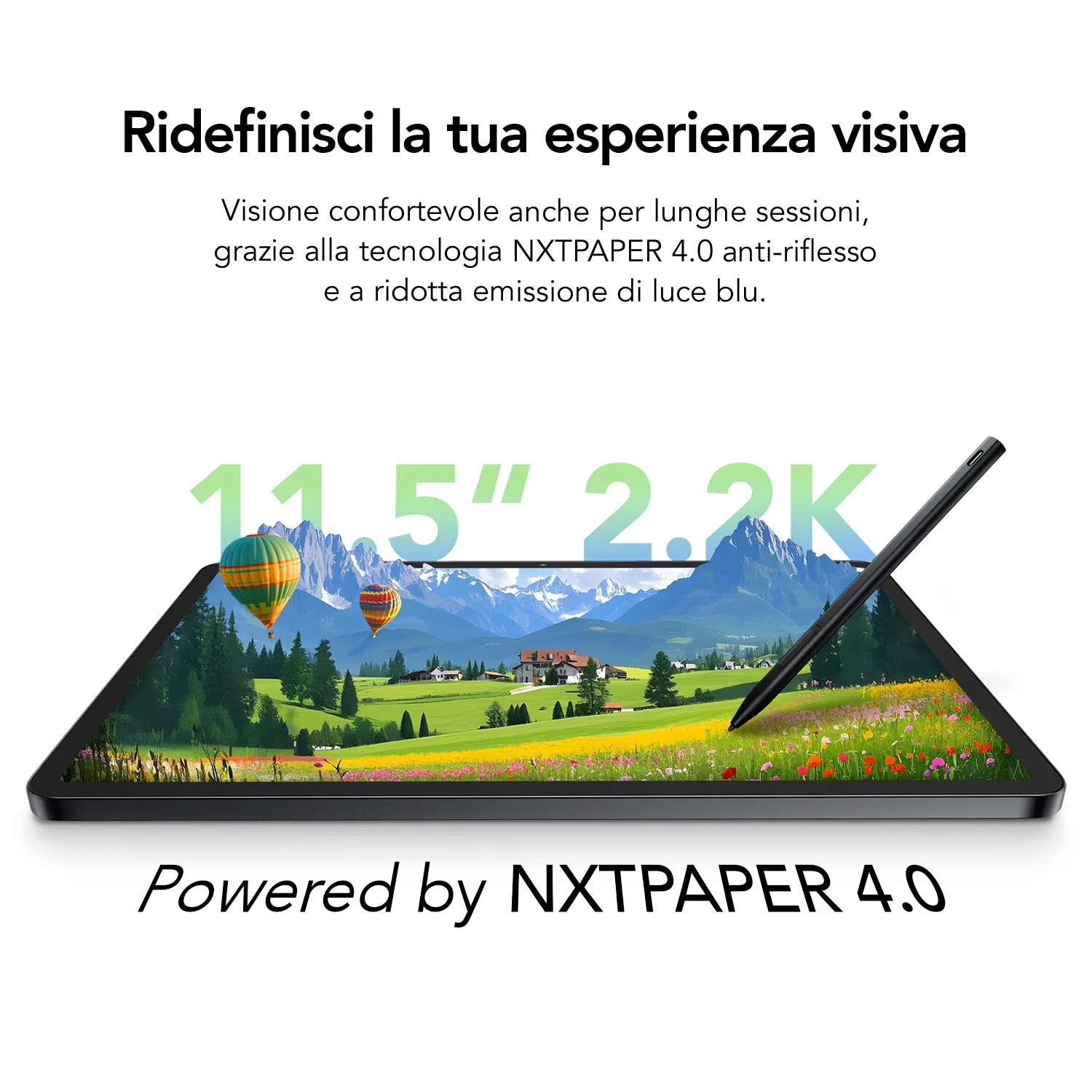 Tecnologia Display Eye-Care<br><br>Il display NXTPAPER 4.0 offre un’esperienza visiva simile alla carta grazie alla superficie antiriflesso e alla ridotta emissione di luce blu, certificata TÜV Rheinland.<br><br>Inoltre, grazie al tasto NXTPAPER passa istantaneamente tra tre modalità di visione: Regolare per l’intrattenimento, Color Paper per la lettura illustrata e Carta Inchiostro per unesperienza simile a un e-reader.<br><br>Esperienza Audiovisiva Coinvolgente<br>Lo schermo da 11,5" con risoluzione 2.2K e refresh rate da 120 Hz garantisce immagini fluide e dettagliate.<br><br>I quattro altoparlanti stereo, ottimizzati da DTS, offrono un suono ricco e potente, per un intrattenimento immersivo a 360 gradi.<br><br>Produttività Intelligente con AI Toolbox<br>Sfrutta strumenti AI per scrivere più velocemente, pianificare in modo efficiente, tradurre testi e trascrivere riunioni in tempo reale.<br><br>Ottimizza lavoro, studio e comunicazione con funzioni smart integrate direttamente nel tablet.<br><br>Prestazioni Elevate e Ampia Memoria<br>Grazie al processore MediaTek Helio G100, alla RAM da 8 GB espandibile virtualmente di altri 8 GB e a una memoria interna da 256 GB, garantisce prestazioni fluide e multitasking senza interruzioni.<br><br>Batteria Potente e Ricarica Rapida<br>Dotato di una batteria ad alta capacità da 8.000 mAh e ricarica rapida da 33W, il tablet si ricarica completamente in appena 2 ore. Inoltre, supporta la ricarica inversa per alimentare altri dispositivi.