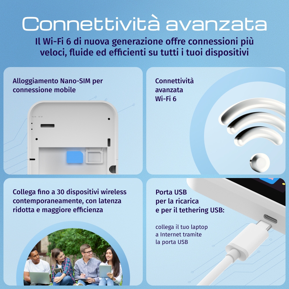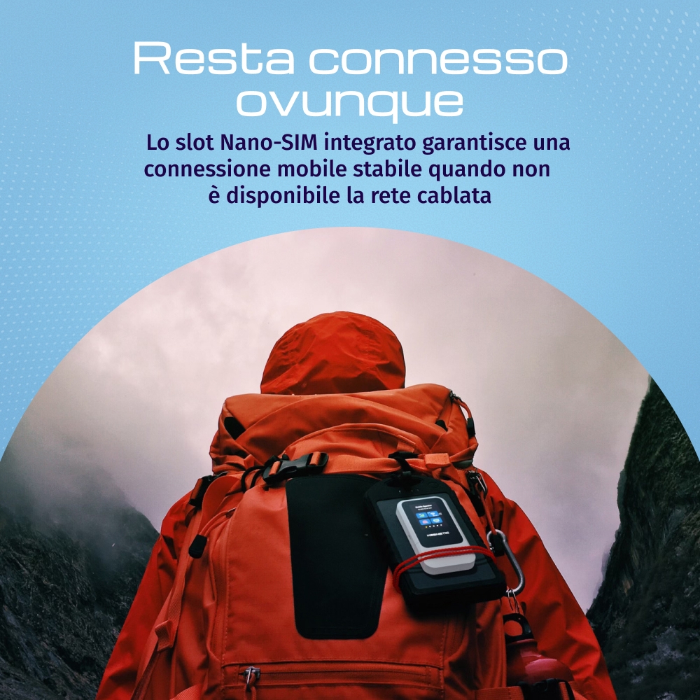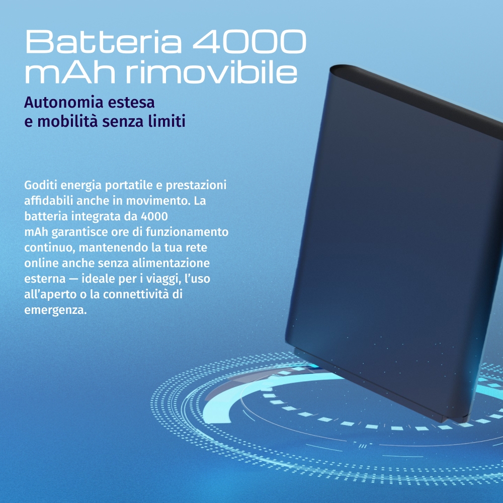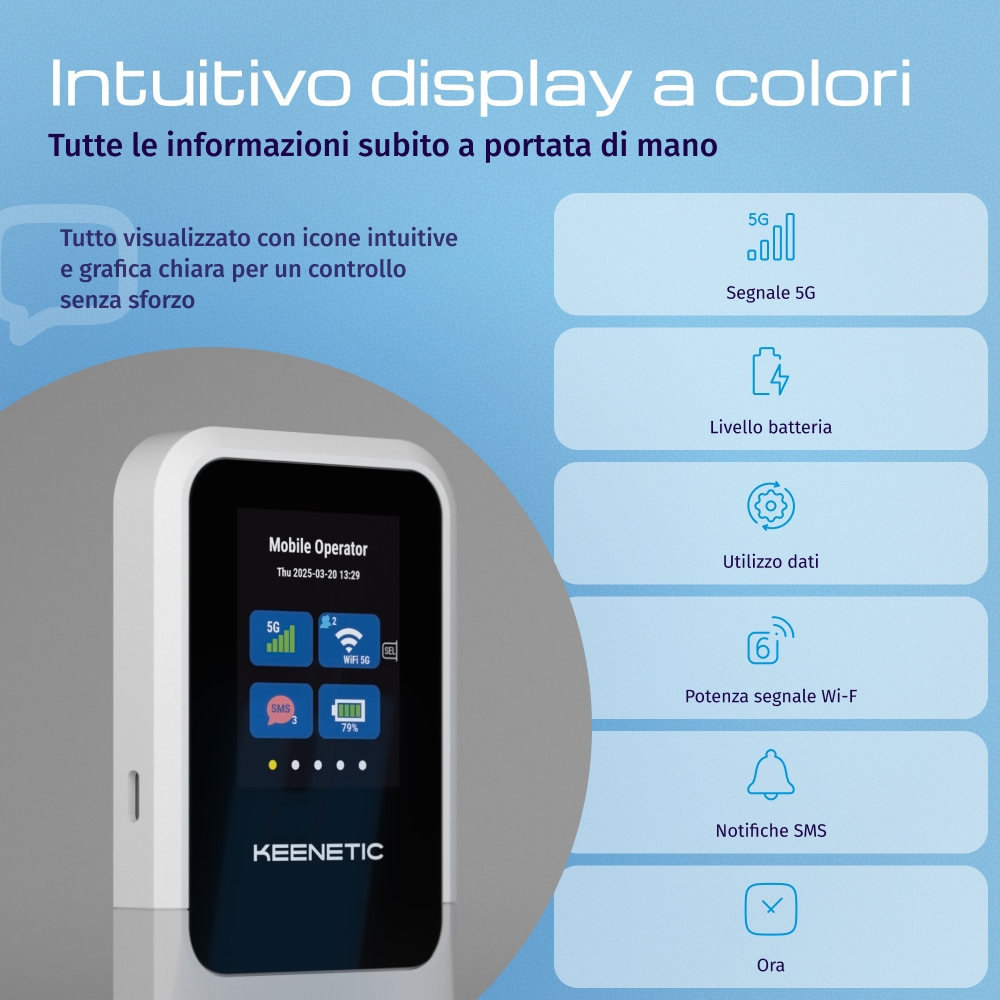 Roamer 5G<br>Hotspot mobile 5G con Wi-Fi 6<br><br>Scopri il futuro del Wi‑Fi portatile, oggi<br>Il tuo hotspot 5G ultra‑veloce con Wi‑Fi 6: perfetto per lavoro, intrattenimento e tutto ciò che conta<br><br>Vivi la velocità del 5G con Roamer 5G, il tuo hotspot tascabile per giornate sempre connesse. Dallo streaming in ultra-HD alle videochiamate senza interruzioni, fino alla condivisione istantanea di file, garantisce prestazioni elevate e massima affidabilità ovunque tu sia. Compatibile con qualsiasi operatore mobile, combina la potenza del 5G con il Wi‑Fi 6 per connettere fino a 30 dispositivi in modo sicuro, stabile e senza colli di bottiglia. Quando serve una connessione migliore, Roamer 5G è la risposta.<br><br>Connettività sicura e senza interruzioni con unautonomia che dura tutto il giorno<br>Dalle riunioni alle uscite del fine settimana connettiti in modo sicuro, senza il minimo sforzo<br><br>Resta connessÉ™ ovunque, tutto il giorno, con Keenetic Roamer 5G: compatto, elegante e sempre al tuo fianco. Il display a colori ti offre in un attimo tutte le informazioni su segnale, traffico dati e batteria. Dì addio alle reti pubbliche non protette: Roamer 5G crea una rete privata e sicura, ovunque tu sia. Leggero da portare, potente quando serve: è il modo più intelligente per connettersi al meglio.<br><br>Pensato per essere veloce<br>Connessione mobile ad alte prestazioni<br><br>Equipaggiato con supporto Nano SIM, schermo LCD da 2,4", Wi-Fi 6 ad alte prestazioni, porta USB Type-C e una potente batteria removibile da 4000 mAh, Keenetic Roamer 5G è la soluzione ideale per chi cerca connettività mobile di livello superiore ovunque si trovi.