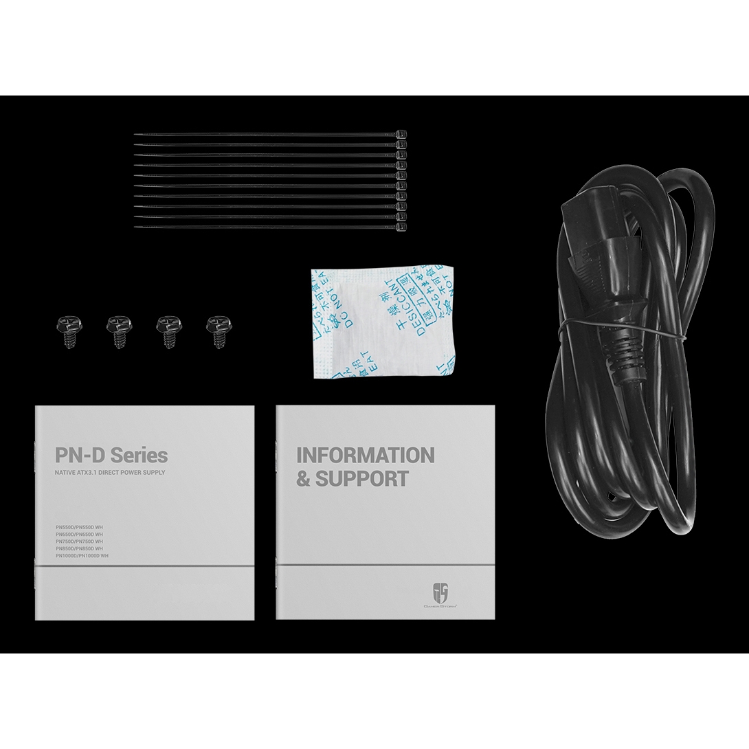 Gamer Storm PN650D. Potenza totale: 650 W, Tensione di ingresso AC: 100 - 240 V, Frequenza di ingresso AC: 50/60 Hz. Connettore scheda madre: 20+4 pin ATX, Lunghezza del cavo di alimentazione della scheda madre: 55 cm, Lunghezza del cavo di alimentazione SATA: 120,450 mm. Utilizzo: PC, Fattore di forma dell'unità di alimentazione (PSU): ATX, Certificazione 80 PLUS: 80 PLUS Gold. Colore del prodotto: Nero, Tipo di raffreddamento: Attivo, Diametro del ventilatore: 12 cm. Cavi inclusi: AC