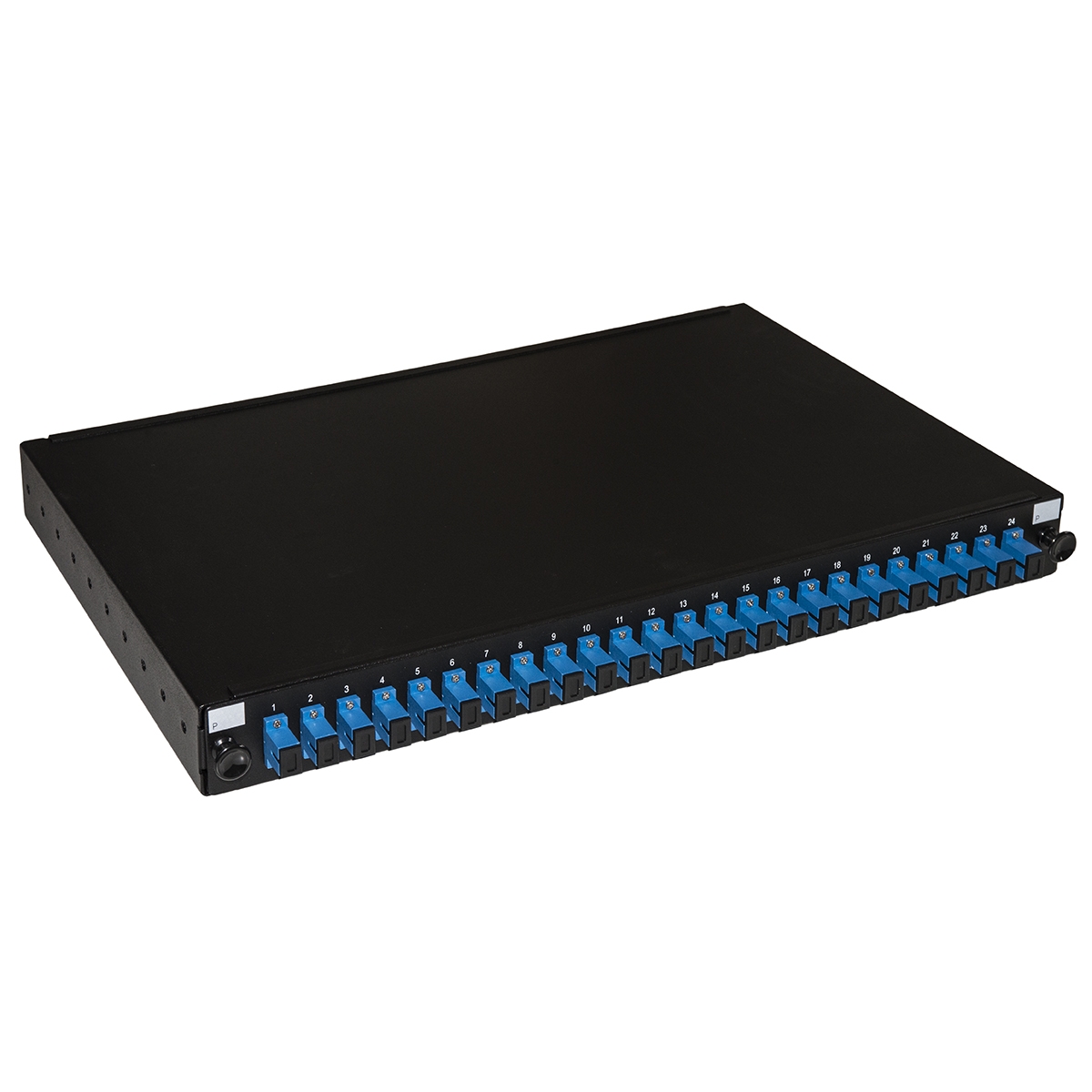 Box di giunzione per fibra ottica, occupa 1 unit? nell?armadio rack.pannello estraibile per fibra ottica in acciaio con 24 porte e 24 adattatori per fibra ottica sc simplex singlemode 9/125 installatil?interno ? gi? equipaggiato per l?installazione dei pigtail, con cassette di giunzione, splice box, guidacavi, tubetti.con 4 asole passacavi aperte per veloce rimozione del pressacavo ed agevole estrazione del vassoio. ampio ingresso posteriore con premarcato removibile per eventuale giunto di spillamento.pigtail non inclusi.il cassetto pu? essere estratto e inclinato verso il basso, agevolando la lavorazione.installabile su armadio rack 19? grazie alle staffe 19? incluse, regolabili per variare la profondit? a cui mettere il cassetto.conforme agli standard sul cablaggio in fibra ottica.colore nero.