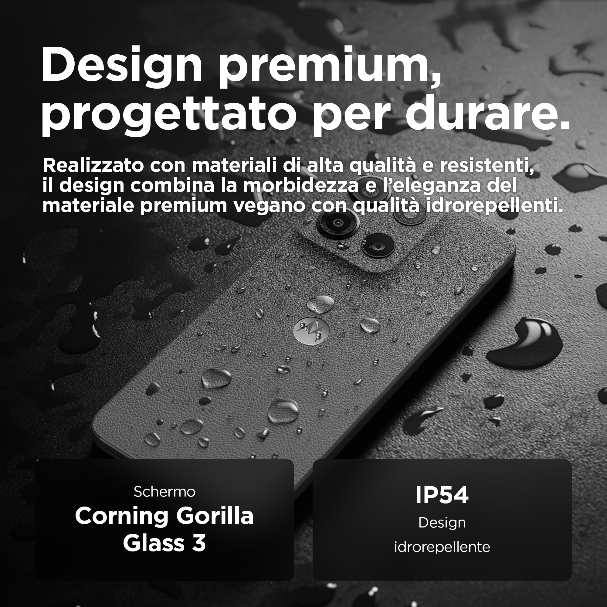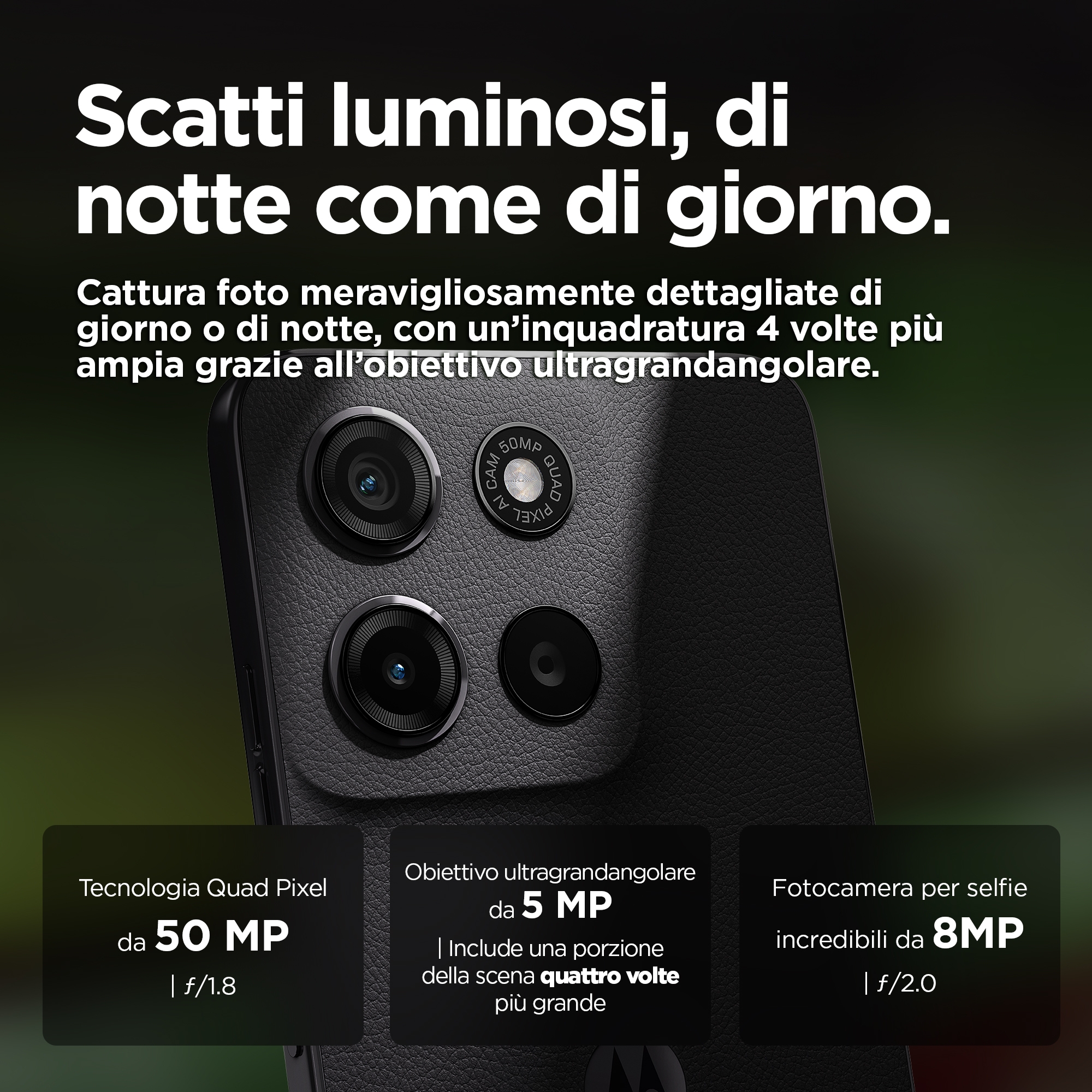 Più grande. Più audace. Più luminoso.<br>Moto g15 ti offre il meglio dellintrattenimento cinematografico. Guarda i tuoi spettacoli e film preferiti su uno schermo Full HD+ da 6,72” sorprendentemente nitido e luminoso, anche allaperto sotto la luce del sole. Ascolta un audio avvolgente grazie ai potenti altoparlanti stereo con Amplificazione bassi e Dolby Atmos®. Scatta foto straordinariamente dettagliate con il comparto fotografico da 50 MP(1) che elimina gli effetti fastidiosi causati dalle sorgenti di luce artificiali. Ricarica velocemente con la ricarica TurboPower™(2) e approfitta di unautonomia maggiore con la batteria da 5200 mAh. Goditi il look raffinato del materiale premium vegano e la protezione offerta dal design idrorepellente(3) e da Corning® Gorilla® Glass 3. Inoltre, grazie alle prestazioni ultra rapide e allampia memoria di archiviazione, avrai sempre spazio per il divertimento. Illumina ogni giornata con Moto g15.