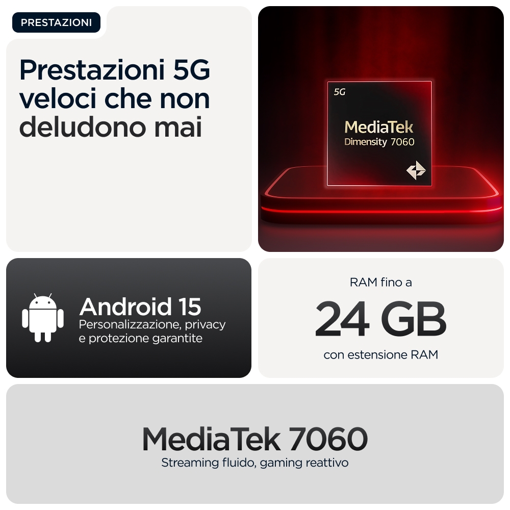 6.72", LCD, 2400 x 1080px, MediaTek Dimensity 7060, 8/256GB, microSD, 50MP + 8MP, 32MP, 5G, Bluetooth 5.3, 802.11 a/b/g/n/ac, USB Type-C, 5200mAh, Android 15