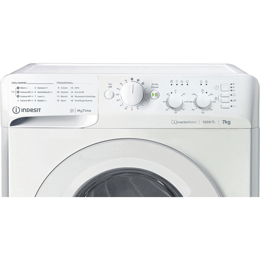 Caratteristiche di questa lavatrice a carica frontale a libera installazione Indesit: cestello spazioso da 7,0 kg. Classe energetica A. Centrifuga a 1200 giri al minuto, rapida ed efficiente. Colore bianco.