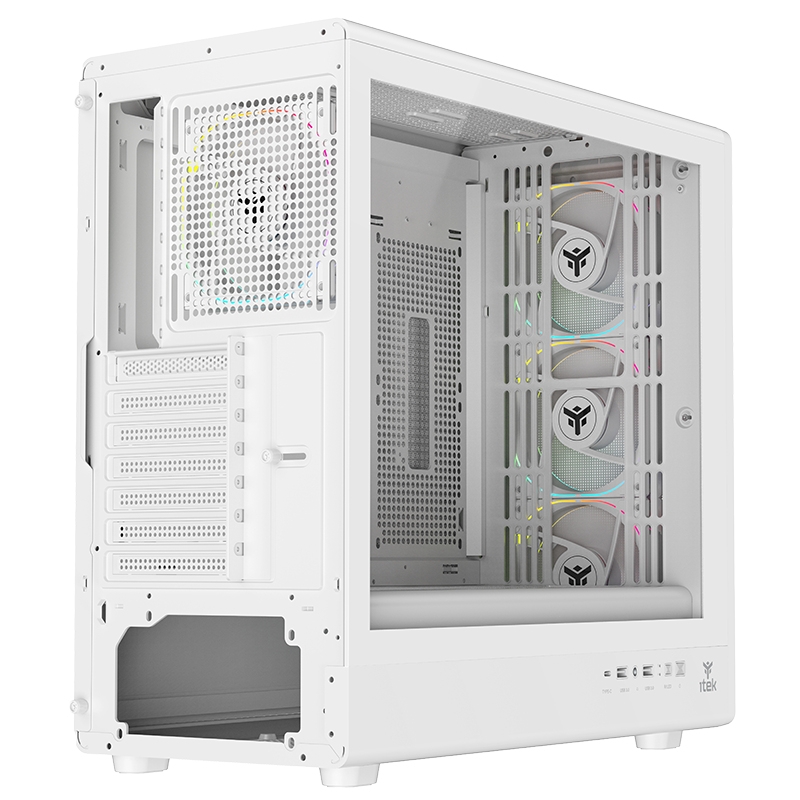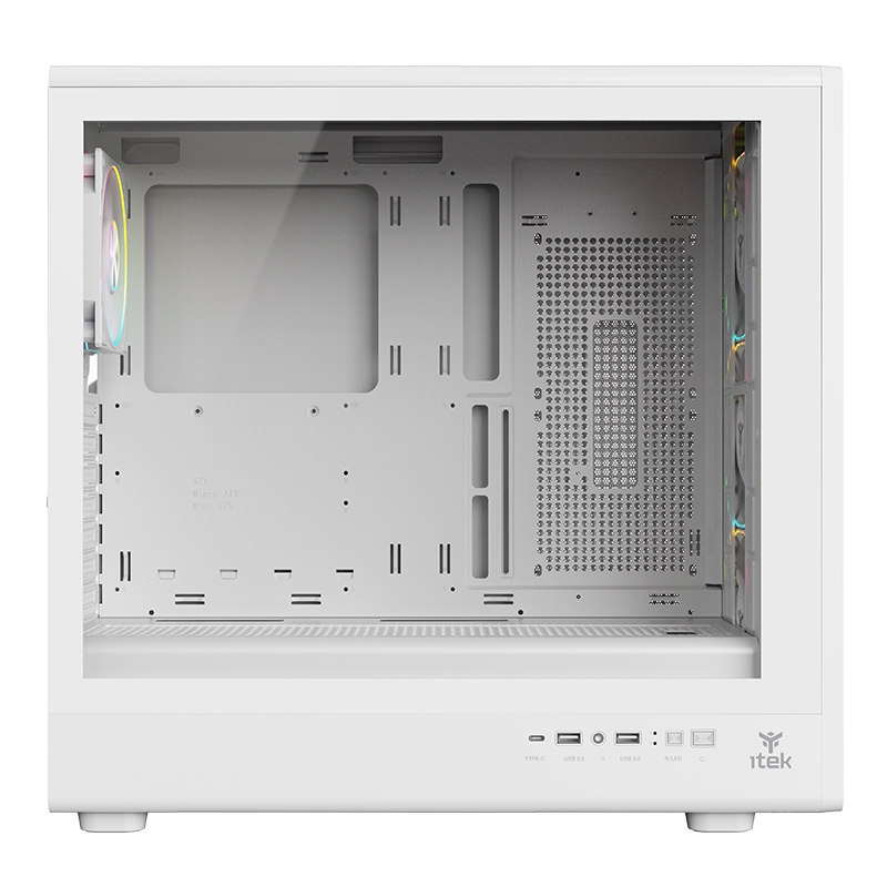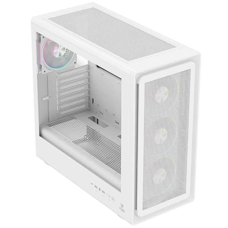 Nell’itek MESHCORE 36 le parole dordine sono: air flow, praticità ed estetica moderna. La paratia frontale è completamente traforata per permettere un ottimo flusso di aria, grazie anche alle 4 ventole ARGB in dotazione, 3 sul frontale e una sul retro, tutte collegate al comodo HUB con telecomando in dotazione. La struttura permette un assemblaggio facile e veloce, con il vano separato per lalimentatore e i dischi HDD/SSD rendendo il tutto esteticamente molto bello e ordinato permettendo linstallazione di schede video di ultima generazione di lunghezza fino a 420mm, dissipatori alti 174mm, liquid cooling fino a 360mm, diverse ventole aggiuntive e il cable management è di 21mm. Sono presenti 2 porte USB 3.0 e una TypeC nella parte laterale del case! Disponibile nella versione Total Black o Full White!