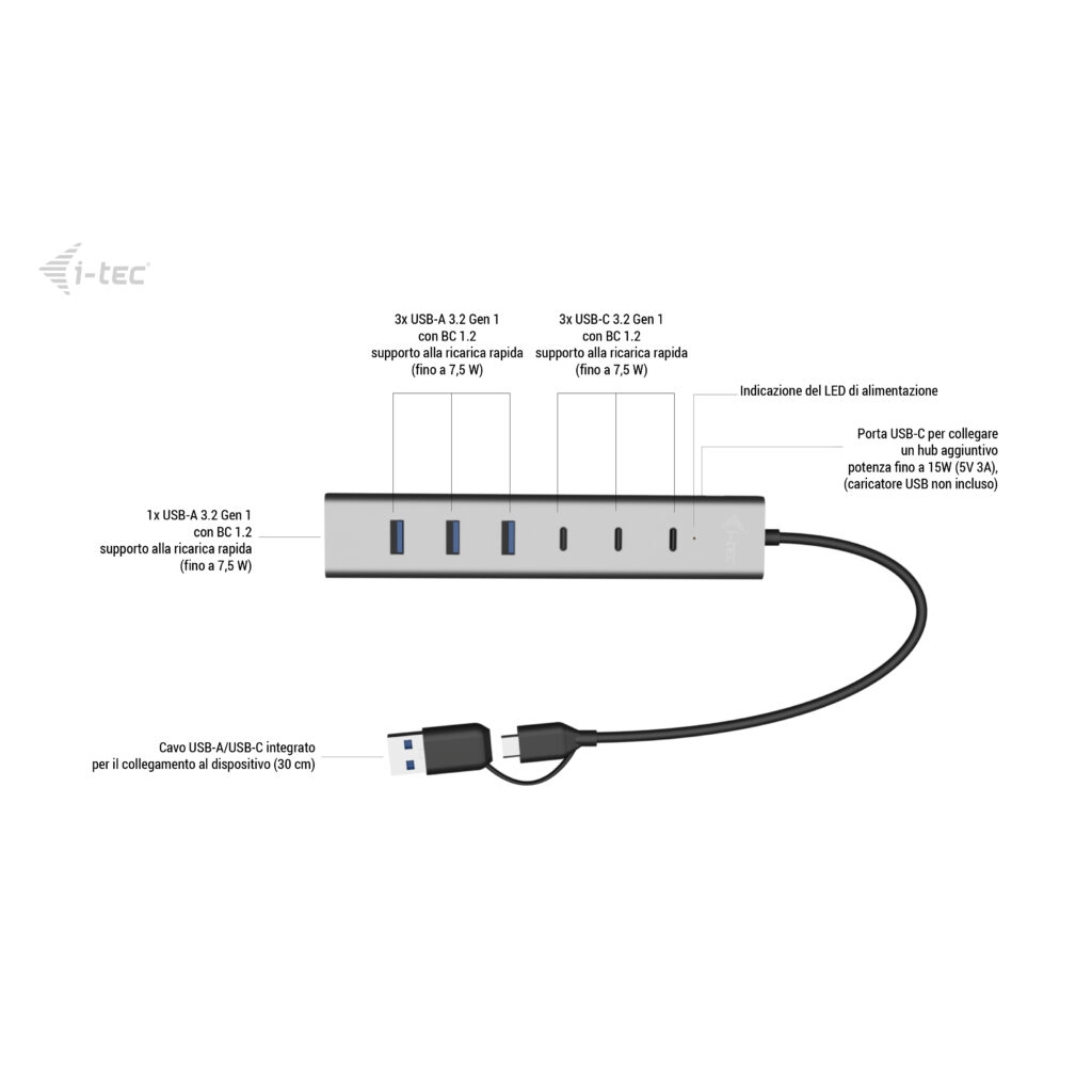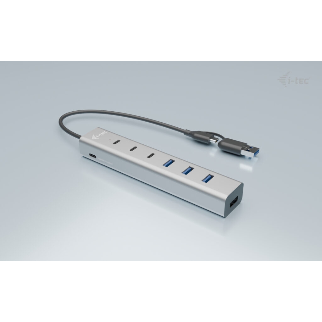 I-tec USB-C/USB-A Charging Metal HUB 7 port (3x USB-C, 4x USB-A), USB 3.2 Gen 1 (3.1 Gen 1) Type-A + Type-C, USB 3.2 Gen 1 (3.1 Gen 1) Type-A, USB 3.2 Gen 1 (3.1 Gen 1) Type-C, 5 Mbit/s, Grigio, 0,3 m, 15 W