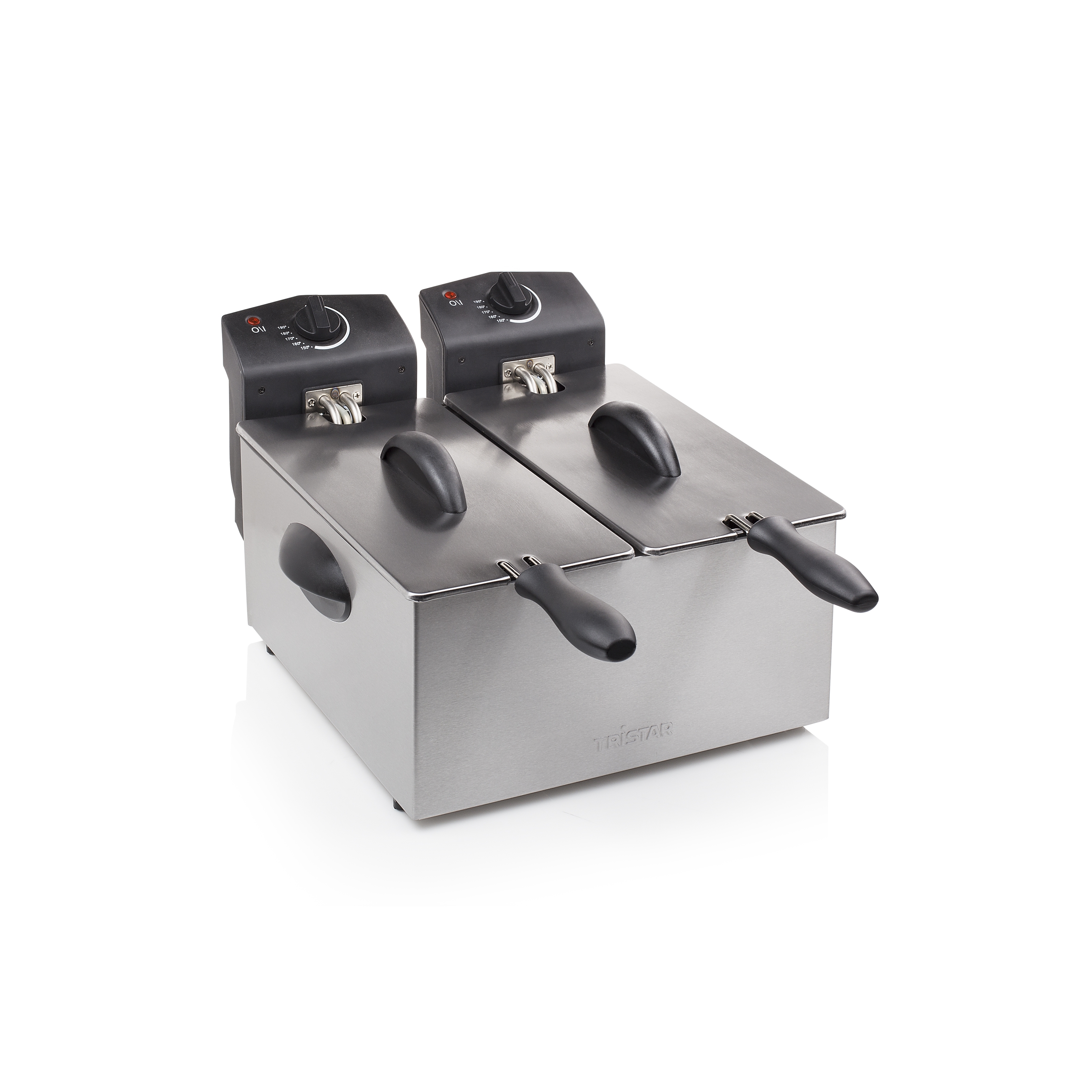 Friggitrice FR-6937 – Capacità 2 x 3 litri – Entrambi recipienti possono essere utilizzati singolarmente <br>La friggitrice FR-6937 è perfetta per friggere diversi prodotti nello stesso momento, oppure se hai una grande famiglia! I doppi recipienti offrono una capacità totale di ben sei litri. Inoltre, entrambi possono essere utilizzati singolarmente ed è possibile impostare temperature diverse o usare una sola friggitrice alla volta.<br><br>Pratico doppio design<br>La friggitrice ha una grande capacità di 2 x 3 litri che la rende perfetta, ad esempio, per preparare patatine e snack nello stesso momento. Dal momento l’olio è separato in entrambi i recipienti, resterà fresco più a lungo. Un ulteriore vantaggio è che i recipienti sono collegati, rendendoli ancora più sicuri e richiedendo una sola presa di corrente. La friggitrice ha una potenza di 2 x 1800 Watt.<br><br>Facile da usare<br>La friggitrice è facile da usare. Entrambi i recipienti hanno un termostato individuale che è possibile impostare fino a 190⁰ C con una manopola. Dal momento che è possibile scegliere una temperatura diversa per i due recipienti, è possibile preparare diversi piatti nello stesso momento o usare una sola delle friggitrici. Per riporre la friggitrice dopo l’uso, è possibile chiudere facilmente il manico senza che tocchi l’olio. È disponibile uno spazio per riporre il cavo.<br><br>Zona fredda<br>La friggitrice è dotata di una zona fredda. Questo significa che è presente uno spazio sotto alla resistenza dove l’olio diventa meno caldo. Tutte le briciole, ad esempio di snack o patatine cadono verso il basso, ma non bruciano, grazie alla zona fredda. In questo modo, lolio rimarrà utilizzabile più a lungo e la frittura sarà più sana.<br><br>Pratica da usare<br>La friggitrice FR-6935 garantisce la massima sicurezza, grazie alla protezione contro il surriscaldamento, e stabilità, grazie ai piedini antiscivolo. Inoltre, la friggitrice è facile da smontare e velocissima da pulire. Inoltre, i singoli componenti possono essere lavati in lavastoviglie. Il recipiente interno smaltato è resistente e facile da usare. <br><br>offre 24 mesi di garanzia su tutti i prodotti.<br><br>Contenuto della confezione<br>Friggitrice Tristar, contenitore interno estraibile, cestello con manico removibile, manuale di istruzioni<br><br>I motivi per scegliere la friggitrice FR-6937:<br>Ampia friggitrice con capacità di 2 x 3 litri che offre molto spazio<br>La friggitrice può essere pulita facilmente e le parti separate sono lavabili in lavastoviglie<br>Puoi facilmente friggere vari prodotti allo stesso tempo, grazie ai due recipienti.<br>Entrambi i recipienti hanno un termostato individuale che li rende facili da usare <br>La zona fredda consente di friggere in modo più sano e mantenere lolio fresco per un tempo più lungo