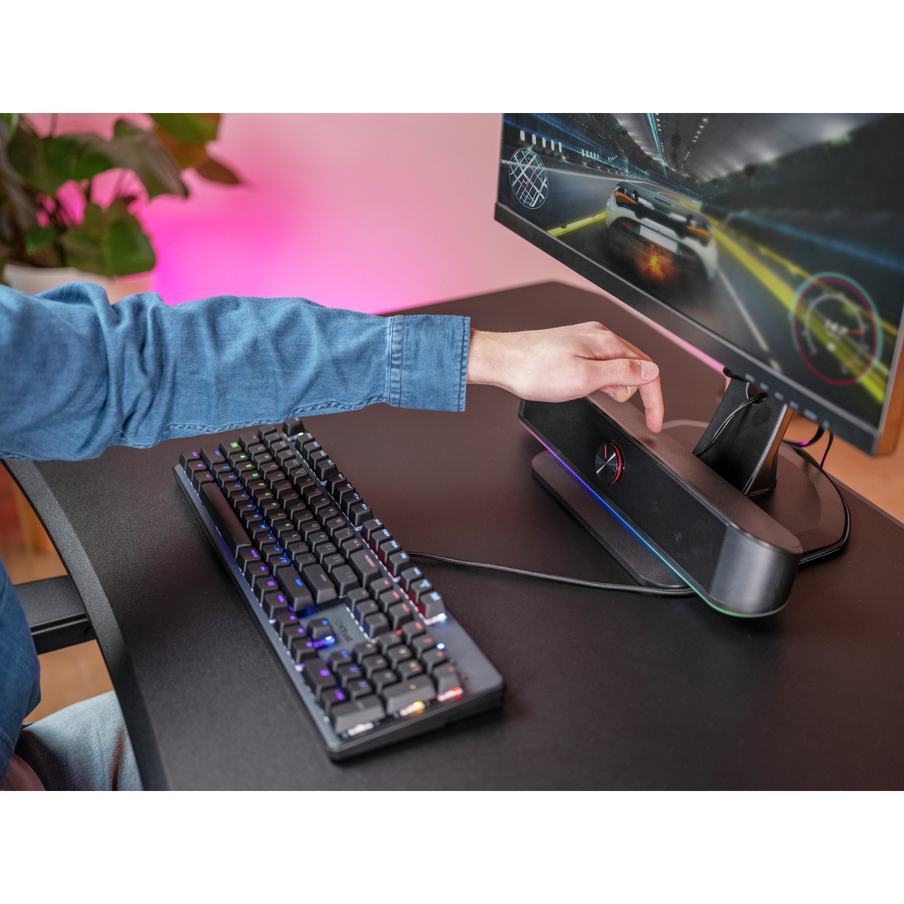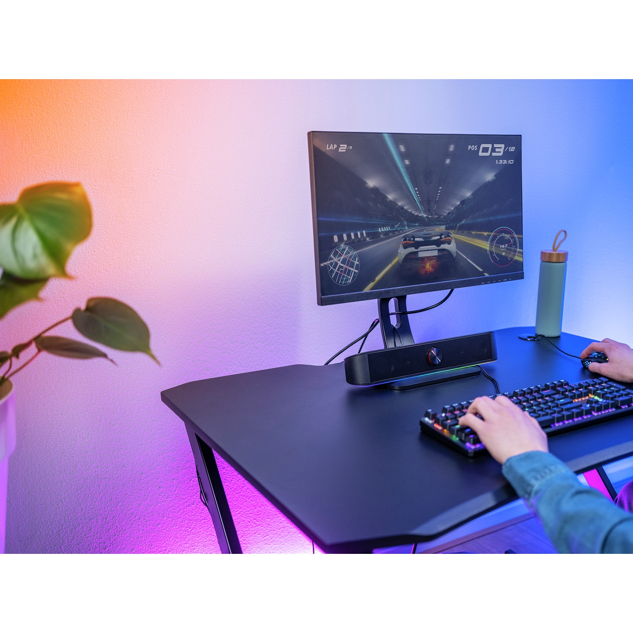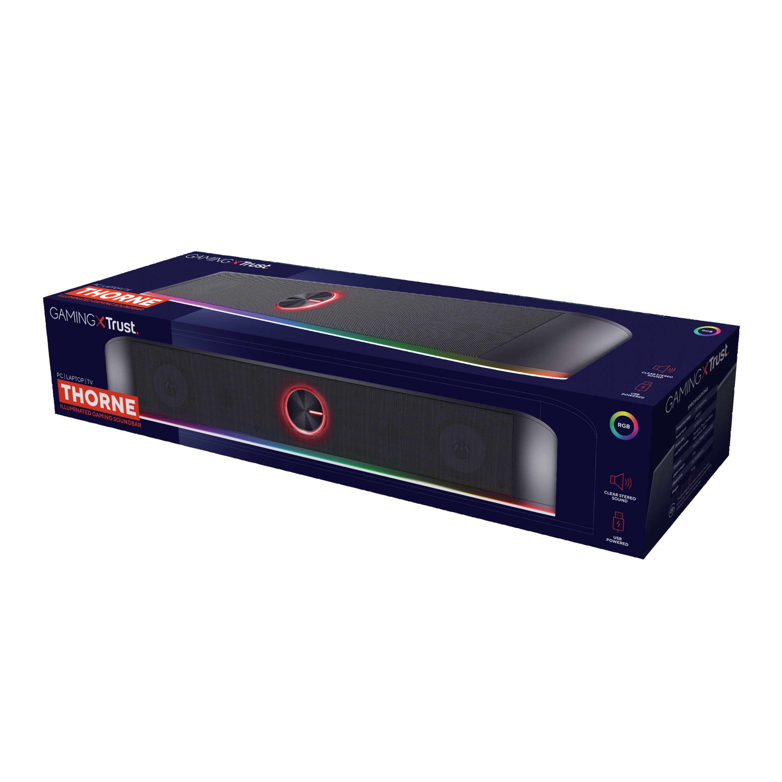 Una soluzione compatta<br>Gli altoparlanti stereo non devono necessariamente essere ingombranti. La sound bar Trust GXT 619 Thorne offre performance da gaming in un fattore di forma compatto. Grazie al nitido audio dello stereo con una potenza di picco di 12W e alle luci RGB, questa sound bar è la soluzione ideale per tutti i gamer che vogliono recuperare un po di spazio, senza però rinunciare a nulla.<br><br>Semplice e solida<br>La sound bar Trust Thorne è perfetta per semplificare al massimo lesperienza di gaming. Basta collegare il cavo AUX al jack per cuffie da 3,5 mm del PC o del laptop e collegare il cavo USB allalimentazione. Non occorre altro per giocare a un livello completamente nuovo. E grazie alle connessioni universali, la sound bar Thorne è compatibile anche con la TV!<br><br>Una nuova luce<br>I gamer esigono esperienze eccellenti. Non solo laudio deve essere di buona qualità: anche locchio vuole la sua parte. La sound bar Trust GXT 619 Thorne è dotata di luci RGB regolabili, con 6 modalità di illuminazione diverse. I giochi assumeranno nuove tinte, grazie a questa sound bar.<br><br>Controllo a portata di mano<br>Grazie allampia manopola illuminata di controllo del volume sulla parte anteriore della sound bar Thorne, potrai regolare facilmente il volume senza distrarti dal gioco. La manopola di controllo facilmente accessibile permette di controllare e di raggiungere facilmente i 12W di potenza di picco (6W RMS) degli altoparlanti stereo incorporati.