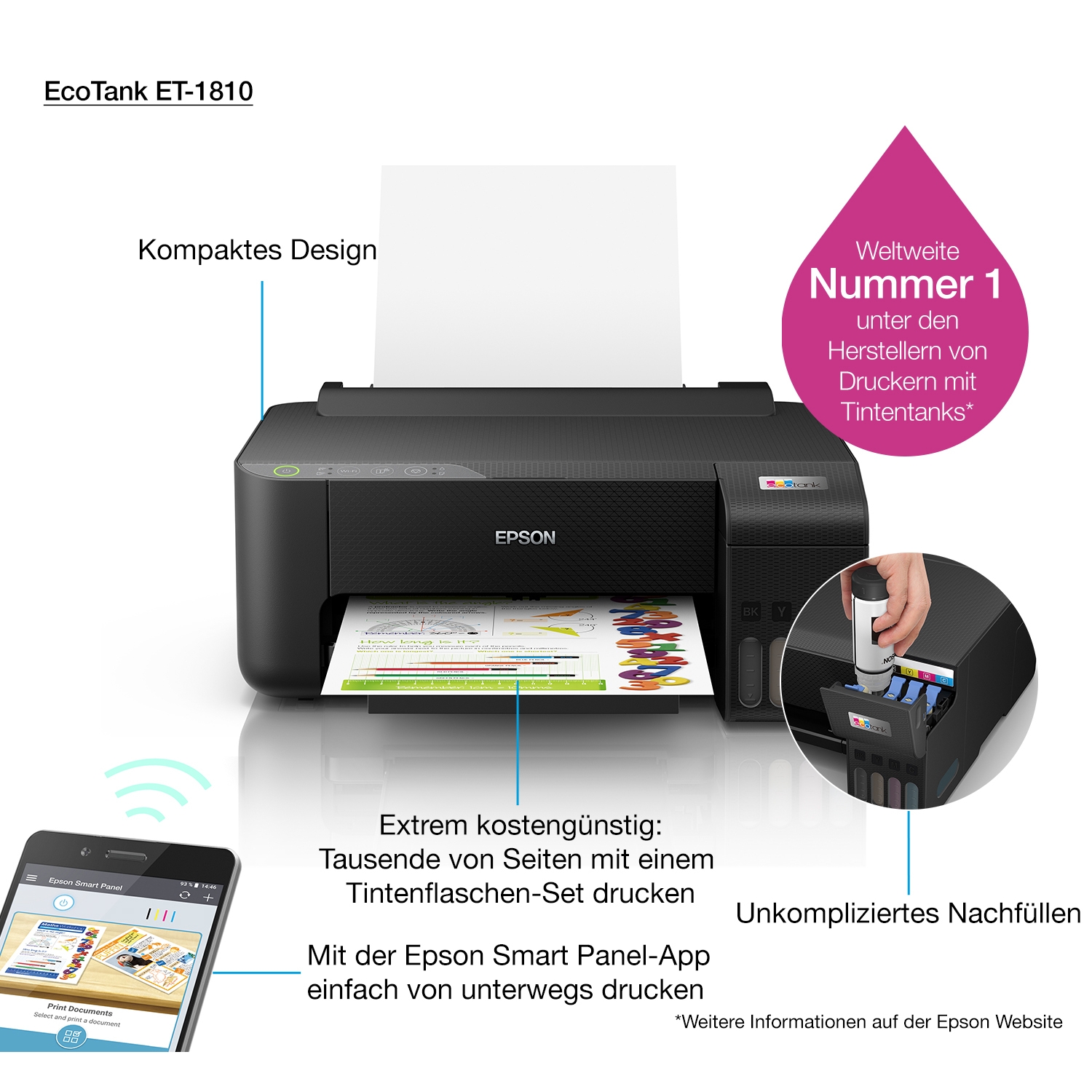 Epson EcoTank ET-1810. A colori, Numero di cartucce di stampa: 4. Risoluzione massima: 5760 x 1440 DPI. Massimo formato carta serie ISO A: A4. Velocità di stampa (nero, qualità normale, A4/US Letter): 33 ppm. Stampa fronte/retro. Wi-Fi. Colore del prodotto: Nero