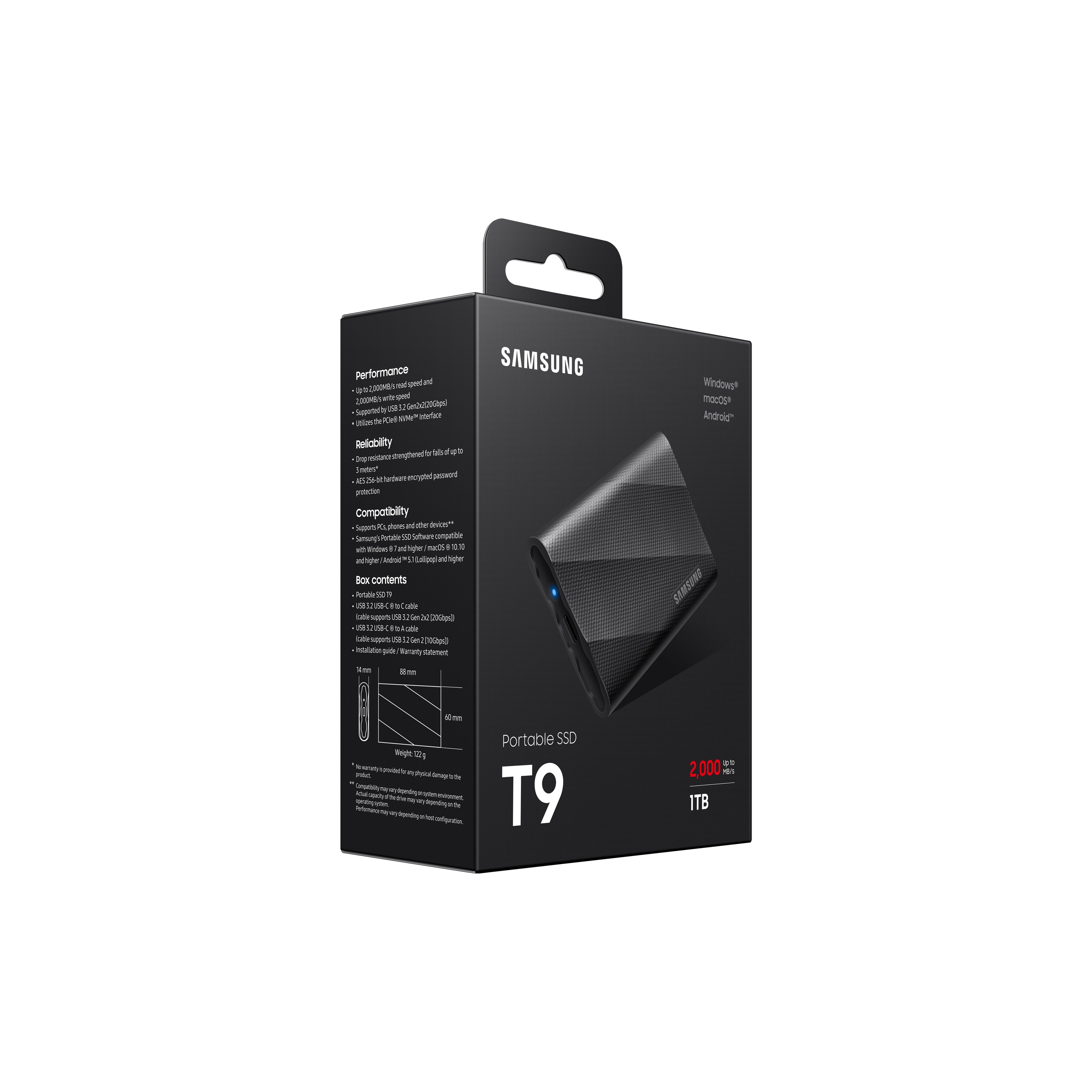 Risparmia tempo e migliora il flusso di lavoro<br>Con linterfaccia USB 3.2 Gen 2x2 e il protocollo NVMe™, il Portable SSD T9 è in grado di trasferire un file di 2 GB in circa un secondo, con velocità di lettura/scrittura sequenziali fino a 2.000 Mb/s. Compatto e potente, ti fa risparmiare tempo durante i trasferimenti dati, velocizza il flusso di lavoro e migliora la produttività.<br><br>Adatto per i tuoi dispositivi<br>T9 è compatibile con tutti i tuoi dispositivi: dagli smartphone e tablet Windows®, macOS® e Android™, alle console per gaming fino alle fotocamere 12K, e molto altro ancora. Nella confezione sono inclusi i cavi USB-C® a C e USB-C® ad A per una maggiore connettività.<br><br>Perfetto da portare sempre con te<br>Con un peso di soli 122 grammi, il Portable SSD T9 è compatto e leggero, ed è disponibile in vari modelli con capacità di 1 TB, 2 TB e 4 TB. Con lesclusiva finitura antiscivolo, i tuoi dati saranno sempre al sicuro nel palmo della tua mano.<br><br>Tecnologia anti-surriscaldamento<br>Grazie alla tecnologia Dynamic Thermal Guard, T9 riduce al minimo le fluttuazioni nelle prestazioni mantenendo la temperatura a livelli ottimali, per supportare elevate velocità di trasferimento in maniera costante. Inoltre, è progettato in conformità con lo standard internazionale IEC 62368-1, per una sicurezza e una protezione extra.<br><br>Dati protetti, zero pensieri<br>Lavora in tutta serenità con T9: progettato per mantenere i tuoi dati sempre al sicuro anche in caso di cadute da altezze fino a 3 metri, è anche coperto da una garanzia limitata di 5 anni. È inoltre possibile aggiungere una password con crittografia AES a 256 bit.<br><br>Software Samsung Magician<br>Utilizza T9 al massimo delle sue potenzialità: scopri il software Samsung Magician, una suite di strumenti di ottimizzazione intuitiva e user-friendly per ottimizzare le prestazioni del tuo SSD. Proteggi dati importanti, tieni monitorato lo stato del drive e ottieni gli ultimi aggiornamenti firmware.<br><br>Diamo vita alle idee<br>Da decenni, la memoria flash NAND di Samsung è al cuore di tecnologie e innovazioni che hanno rivoluzionato la nostra vita quotidiana in tutti i suoi aspetti. La tecnologia flash NAND è anche integrata nei nostri drive SSD, per aprire la strada alla prossima rivoluzione nellera dellinnovazione.<br><br>Trasferimento dati super veloce<br>Migliora lefficienza del tuo flusso di lavoro con il Portable SSD T9, che consente velocità di lettura/scrittura sequenziali fino a 2.000 Mb/s grazie allinterfaccia USB 3.2 Gen 2x2 di ultima generazione.<br><br>Compatibilità universale<br>T9 è compatibile con gli smartphone e i tablet Windows®, macOS® e Android™, console per gaming e fotocamere 12K.<br><br>Massima affidabilità<br>Con il Portable SSD T9, i tuoi dati saranno al sicuro anche in caso di cadute da altezze fino a 3 metri, senza dimenticare la garanzia limitata di 5 anni.