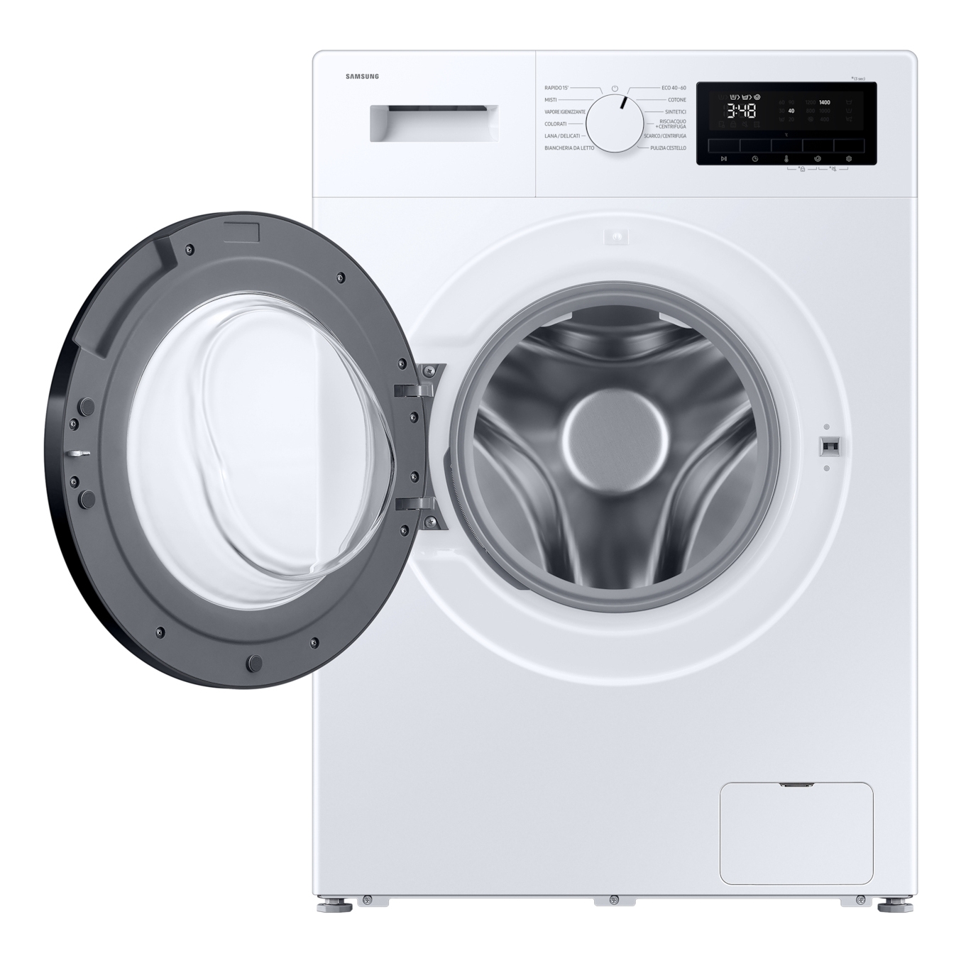 Samsung Lavatrice Serie 3000 9Kg WW90DG5G34AEET. Tipo di carica: Caricamento frontale. Capacità cestello: 9 kg, Classe di efficienza della centrifuga: B, Silenziosità (centrifuga): 76 dB, Velocità di centrifuga massima: 1400 Giri/min. Colore del prodotto: Bianco. Larghezza: 595 mm, Profondità: 505 mm, Altezza: 850 mm. Classe efficienza energetica: A